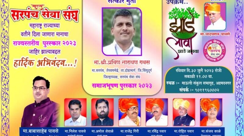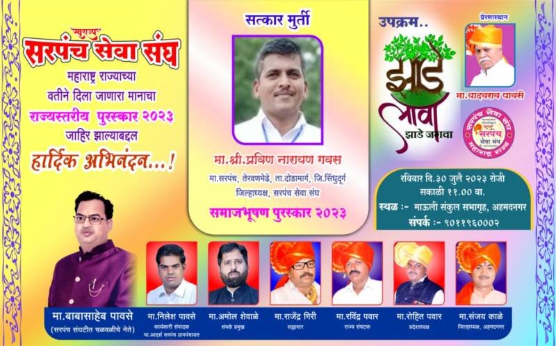 ЁЯО┤рджреЛрдбрд╛рдорд╛рд░реНрдЧ, рджрд┐-резрек:- рд╕реНрд╡рд░рд╛рдЬреНрдп рд╕рд░рдкрдВрдЪ рд╕реЗрд╡рд╛ рд╕рдВрдШ рдорд╣рд╛рд░рд╛рд╖реНрдЯреНрд░ рд░рд╛рдЬреНрдп рдпрд╛рдВрдЪреНрдпрд╛рдХрдбреВрди рджрд┐рд▓реНрдпрд╛ рдЬрд╛рдгрд╛рд░рд╛ рд╕рд╛рдорд╛рдЬрднреВрд╖рдг рдкреБрд░рд╕реНрдХрд╛рд░ рд╕рд╛рдорд╛рдЬрд┐рдХ рдХрд╛рд░реНрдпрдХрд░реНрддреЗ рддрдерд╛ рд╕рд┐рдВрдзреБрджреБрд░реНрдЧ рд╕рд░рдкрдВрдЪ рд╕реЗрд╡рд╛ рд╕рдВрдШрд╛рдЪреЗ рдЬрд┐рд▓реНрд╣рд╛рдзреНрдпрдХреНрд╖ рдкреНрд░рд╡рд┐рдг рдЧрд╡рд╕ рдпрд╛рдВрдирд╛ рдЬрд╛рд╣реАрд░ рдЭрд╛рд▓рд╛ рдЖрд╣реЗ. рд╕рджрд░ рдкреБрд░рд╕реНрдХрд╛рд░ рд░рд╡рд┐рд╡рд╛рд░ рейреж рдЬреБрд▓реИ рд░реЛрдЬреА рдЕрд╣рдорджрдирдЧрд░ рдпреЗрдереЗ рд╡рд┐рддрд░рд┐рдд рдХреЗрд▓рд╛ рдЬрд╛рдгрд╛рд░ рдЖрд╣реЗ. рдпрд╛рджрд╡рд░рд╛рд╡ рдкрд╛рд╡рд╕реЗ рдпрд╛рдВрдЪреНрдпрд╛ рдкреНрд░реЗрд░рдгреЗрдиреЗ рд╣реЛрдгрд╛рд▒реНрдпрд╛ рдпрд╛ рд╕реЛрд╣рд│реНрдпрд╛рд╕ рдпрд╛рд╡реЗрд│реА рд╕рд░рдкрдВрдЪ рдЪрд│рд╡рд│реАрдЪреЗ рдиреЗрддреЗ рдмрд╛рдмрд╛рд╕рд╛рд╣реЗрдм рдкрд╛рд╡рд╕реЗ, рдирд┐рддреЗрд╢ рдкрд╛рд╡рд╕реЗ (рдЖрджрд░реНрд╢ рд╕рд░рдкрдВрдЪ рдЧреНрд░рд╛рдордкрдВрдЪрд╛рдпрдд рд╕рдВрдкрд╛рджрдХ), рд╕рдВрдкрд░реНрдХ рдкреНрд░рдореБрдЦ рдЕрдореЛрд▓ рд╢реЗрд╡рд╛рд│реЗ, рд╕рд▓реНрд▓рд╛рдЧрд╛рд░ рд░рд╛рдЬреЗрдВрджреНрд░ рдЧреАрд░реА, рд░рд╛рдЬреНрдпрд╕рдВрдШрдЯрдХ рд░рд╡реАрдВрджреНрд░ рдкрд╡рд╛рд░, рдкреНрд░рджреЗрд╢рд╛рдзреНрдпрдХреНрд╖ рд░реЛрд╣рд┐рдд рдкрд╡рд╛рд░, рдЕрд╣рдорджрдирдЧрд░ рдЬрд┐рд▓реНрд╣рд╛рдзреНрдпрдХреНрд╖ рд╕рдВрдЬрдп рдХрд╛рд│реЗ рд╣реЗ рдЙрдкрд╕реНрдерд┐рдд рдЕрд╕рдгрд╛рд░ рдЖрд╣реЗрдд.