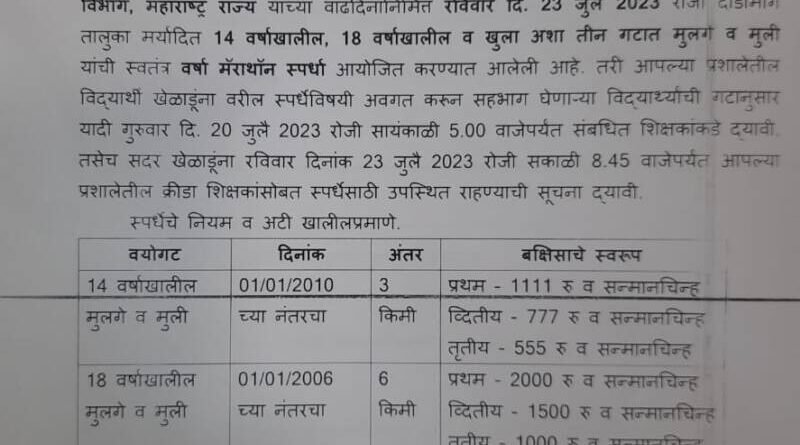 рд╕реНрдкрд░реНрдзреЗрдЪреА рдиреЛрдВрджрдгреА рдЧреБрд░реБрд╡рд╛рд░ рджрд┐рдирд╛рдВрдХ реиреж рдЬреБрд▓реИ реирежреирей рдкрд░реНрдпрдВрдд рд╕рд╛рдпрдВрдХрд╛рд│реА рел рд╡рд╛рдЬреЗ рдкрд░реНрдпрдВрдд рд╕рд╛рдЯреЗрд▓реА – рднреЗрдбрд╢реА рдкреНрд░рднрд╛рдЧ рд╣рдиреБрдордВрдд рд╕рд╛рд╡рдВрдд рднреЗрдбрд╢реА рд╣рд╛рдпрд╕реНрдХреВрд▓- репрекрежрекрезренрейрезрезрел рд╡ рджреЛрдбрд╛рдорд╛рд░реНрдЧ рдкреНрд░рднрд╛рдЧ рдЖрдирдВрджрд╛ рдмрд╛рдордгреАрдХрд░, рджреЛрдбрд╛рдорд╛рд░реНрдЧ рд╣рд╛рдпрд╕реНрдХреВрд▓ – репрекреирейреиренреиреоремреи рдпрд╛рдВрдЪреНрдпрд╛ рдХрдбреЗ рдХрд░рд╛рд╡реА, рддрд╕реЗрдЪ рдкреНрд░рддреНрдпреЗрдХ рдЦреЗрд│рд╛рдбреВрдиреЗ рдпреЗрддрд╛рдирд╛ рдЖрдкрд▓реЗ рдЖрдзрд╛рд░ рдХрд╛рд░реНрдб рдЖрдгрдгреЗ рдЕрдирд┐рд╡рд╛рд░реНрдп рдЖрд╣реЗ.рд╕рд░реНрд╡ рд╕рд╣рднрд╛рдЧреА рд╡рд┐рджреНрдпрд╛рд░реНрдереНрдпрд╛рдВрдирд╛ рд╡ рдЦреЗрд│рд╛рдбреВрдВрдирд╛ рдкреНрд░рд╢рд╕реНрддреАрдкрддреНрд░рдХ рд╡ рдЕрд▓реНрдкреЛрдкрд╣рд╛рд░ рджреЗрдгреНрдпрд╛рдд рдпреЗрдИрд▓. рддрд╛рд▓реБрдХреНрдпрддреАрд▓ рдЬрд╛рд╕реНрддреАрдд рдЬрд╛рд╕реНрдд рдЦреЗрд│рд╛рдбреВрдВрдиреА рд╕рд╣рднрд╛рдЧ рдШреНрдпрд╛рд╡рд╛ рдЕрд╕реЗ рдЖрд╡рд╛рд╣рди рдмрд╛рд│рд╛рд╕рд╛рд╣реЗрдмрд╛рдВрдЪреА рд╢рд┐рд╡рд╕реЗрдирд╛ рддрд╛рд▓реБрдХрд╛ рдкреНрд░рдореБрдЦ рдЧрдгреЗрд╢рдкреНрд░рд╕рд╛рдж рдЧрд╡рд╕ рдпрд╛рдВрдиреА рдХреЗрд▓реЗ рдЖрд╣реЗ.
