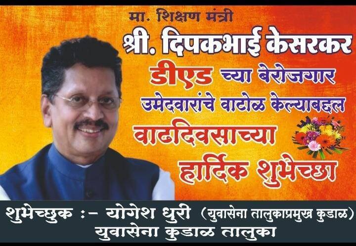 *ЁЯО┤рдХреБрдбрд╛рд│, рджрд┐-резрен:-* рд╢рд╛рд▓реЗрдп рд╢рд┐рдХреНрд╖рдгрдордВрддреНрд░реА рджрд┐рдкрдХ рдХреЗрд╕рд░рдХрд░ рдпрд╛рдВрдЪреНрдпрд╛ рд╡рд╛рдврджрд┐рд╡рд╕рд╛рдЪреНрдпрд╛ рдирд┐рдорд┐рддреНрддрд╛рдиреЗ рдЖрдЬ рдпреБрд╡рд╛рд╕реЗрдиреЗрдЪреНрдпрд╛ рдорд╛рдзреНрдпрдорд╛рддреВрди рддрд╛рд▓реБрдХрд╛рдкреНрд░рдореБрдЦ рдпреЛрдЧреЗрд╢ рдзреБрд░реА рдпрд╛рдВрдЪреНрдпрд╛ рдиреЗрддреГрддреНрд╡рд╛рдЦрд╛рд▓реА рдЖрдВрджреЛрд▓рди рдХрд░рдгреНрдпрд╛рдд рдЖрд▓реЗ. рдпрд╛рд╡реЗрд│реА рд▓рд╛рд╡рдгреНрдпрд╛рдд рдЖрд▓реЗрд▓реЗ рдмреЕрдирд░ рдорд╛рддреНрд░ рдЪрд░реНрдЪреЗрдЪрд╛ рд╡рд┐рд╖рдп рдард░рдд рд╣реЛрддреЗ. рдбреА рдПрдб рдмреА рдПрдб рдмреЗрд░реЛрдЬрдЧрд╛рд░рд╛рдВрдирд╛ рдиреНрдпрд╛рдп рдорд┐рд│рд╛рд╡рд╛ рдпрд╛рд╕рд╛рдареА рдпреЛрдЧреЗрд╢ рдзреБрд░реА рдЖрдгреА рдпреБрд╡реЗрд╕реЗрдиреЗрдиреЗ рдпрд╛рдкреВрд░реНрд╡реА рджреЗрдЦреАрд▓ рдЕрдиреЗрдХ рдкреНрд░рдпрддреНрди рдХреЗрд▓реЗ рд╣реЛрддреЗ. рддрд░ рдЖрдЬ рдПрдХрдкреНрд░рдХрд╛рд░реЗ рдмреЕрдирд░ рдЪреНрдпрд╛ рдорд╛рдзреНрдпрдорд╛рддреВрди рд╢реБрднреЗрдЪреНрдЫрд╛ рджреЗрдгреНрдпрд╛рдд рдЖрд▓реНрдпрд╛ рддрд░ рдпрд╛ рд╕рдВрдзрд░реНрднрд╛рдд рдпреЛрдЧреЗрд╢ рдзреБрд░реА рдпрд╛рдВрдЪреНрдпрд╛рд╢реА рд╕рдВрдкрд░реНрдХ рдХреЗрд▓рд╛ рдЕрд╕рддрд╛ рдмреЗрд░реЛрдЬрдЧрд╛рд░ рдЙрдореЗрджрд╡рд╛рд░рд╛рдВрдирд╛ рдиреНрдпрд╛рди рди рджрд┐рд▓реНрдпрд╛рд╕ рдпрд╛рдкреБрдвреЗрдВ рдЬрд┐рд▓реНрд╣реНрдпрд╛рдд рддреАрд╡реНрд░ рдЖрдВрджреЛрд▓рди рдХрд░реВ рдЕрд╕рд╛ рдИрд╢рд╛рд░рд╛ рджреЗрдгреНрдпрд╛рдд рдЖрд▓рд╛.