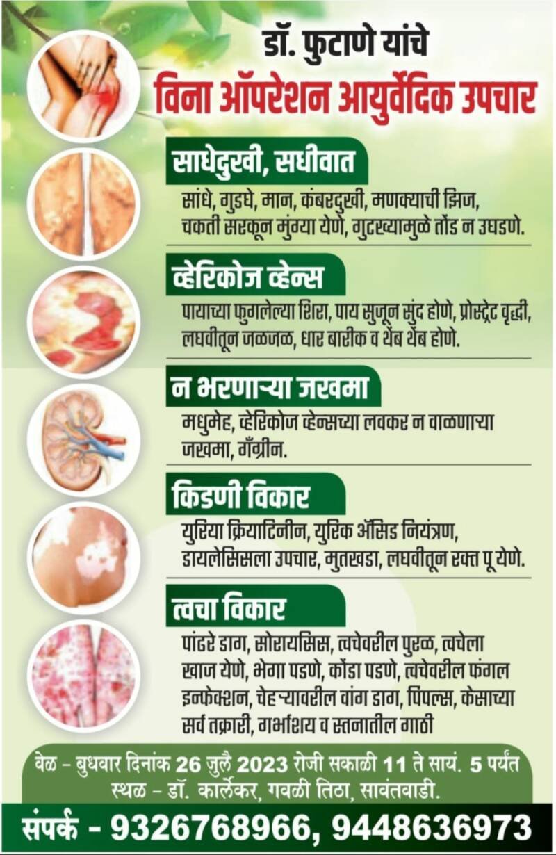 *बुधवार* *दि* 26* *जूलै* *रोजी *सावंतवाडी* येथे तपासणी व उपचारासाठी येतील.