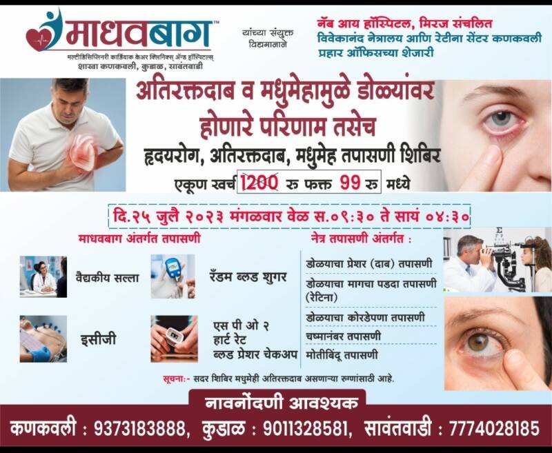 कणकवली, माधवबाग आणि मिरज नॅब आय हॉस्पिटल यांच्या संयुक्त विद्यमाने मधुमेही आणि अतिरक्तदाबाची समस्या असणाऱ्या रुग्णांसाठी खास डोळ्यांचे तपासणी शिबिर दिनांक २५ जुलैला सकाळी ९.३० ते ४.३० या वेळेत माधवबाग कणकवली, कुडाळ, सावंतवाडी येथे आयोजित करण्यात आले आहे.