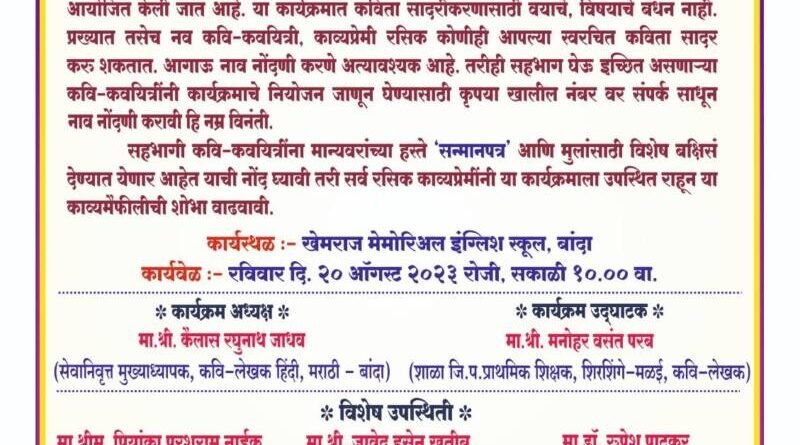ЁЯЯе рдЦреЗрдорд░рд╛рдЬ рдореЗрдореЛрд░рд┐рдЕрд▓ рдЗрдВрдЧреНрд▓рд┐рд╢ рд╕реНрдХреВрд▓ рдмрд╛рдВрджрд╛ рдпреЗрдереЗ рд░рд╡рд┐рд╡рд╛рд░ рджрд┐.реиреж рдСрдЧрд╕реНрдЯ рд░реЛрдЬреА рдЦреБрд▓реНрдпрд╛ рдЬрд┐рд▓реНрд╣рд╛рд╕реНрддрд░реАрдп рдирдХреНрд╖рддреНрд░ рдХрд╛рд╡реНрдпрдореИрдлрд▓реАрдЪреЗ рдЖрдпреЛрдЬрди..