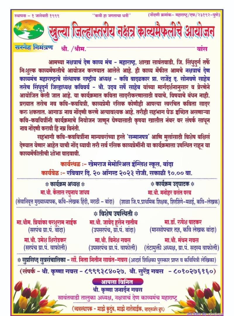 рд╕рд╣рднрд╛рдЧреА рдХрд╡реА – рдХрд╡рдпреАрддреНрд░рд┐рдВрдирд╛ рдорд╛рдиреНрдпрд╡рд░рд╛рдВрдЪреНрдпрд╛ рд╣рд╕реНрддреЗ рд╕рдиреНрдорд╛рдирдкрддреНрд░ рдЖрдгрд┐ рдореБрд▓рд╛рдВрд╕рд╛рдареА рд╡рд┐рд╢реЗрд╖ рдмрдХреНрд╖реАрд╕ рджреЗрдгреНрдпрд╛рдд рдпреЗрдгрд╛рд░ рдЖрд╣реЗ.рддрд░реА рд╕рд░реНрд╡ рд░рд╕рд┐рдХ рдХрд╛рд╡реНрдп рдкреНрд░реЗрдореАрдВрдиреА рдпрд╛ рдХрд╛рд░реНрдпрдХреНрд░рдорд╛рд▓рд╛ рдЙрдкрд╕реНрдерд┐рдд рд░рд╛рд╣реВрди рдпрд╛ рдХрд╛рд╡реНрдп рдореИрдлрд┐рд▓реАрдЪреА рд╢реЛрднрд╛ рд╡рд╛рдврд╡рд╛рд╡реА рдЕрд╕реЗ рдЖрд╡рд╛рд╣рди рдЖрдордЪреНрдпрд╛ рдирдХреНрд╖рддреНрд░рд╛рдЪ рджреЗрдг рдХрд╛рд╡реНрдп рдордВрдЪ – рдорд╣рд╛рд░рд╛рд╖реНрдЯреНрд░ рд╢рд╛рдЦрд╛ рд╕рд╛рд╡рдВрддрд╡рд╛рдбреА рдЬрд┐.рд╕рд┐рдВрдзреБрджреБрд░реНрдЧрдЪреНрдпрд╛ рд╡рддреАрдиреЗ рдХрд░рдгреНрдпрд╛рдд рдЖрд▓реЗ рдЖрд╣реЗ.рдпрд╛ рд╕рдВрдкреВрд░реНрдг рдХрд╛рд░реНрдпрдХреНрд░рдорд╛рдЪреЗ рд╡реНрдпрд╡рд╕реНрдерд╛рдкрди – рдорд╛рдЭреЗ рдХреБрдЯреБрдВрдм рдорд╛рдЭреЗ рдирд╛рддреЗрд╡рд╛рдИрдХ рд╡реНрд╣реЙрдЯреНрд╕ре▓рдк рдЧреНрд░реВрдк рдЪреНрдпрд╛ рд╡рддреАрдиреЗ рдЖрдпреЛрдЬрд┐рдд рдХреЗрд▓реЗ рдЖрд╣реЗ.рд╕рд░реНрд╡рд╛рдВрдирд╛ рд╡рд┐рдирд╛рдореВрд▓реНрдп рдореБрдХреНрдд рдкреНрд░рд╡реЗрд╢ рдЖрд╣реЗ рдЕрд╕реЗ рдХрд╡рд┐рд╡рд░реНрдп рдХреГрд╖реНрдгрд╛ рдЧрд╡рд╕ рдпрд╛рдВрдиреА рдХрд│рд╡рд┐рд▓реЗ рдЖрд╣реЗ.
