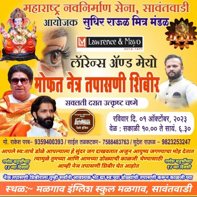 ЁЯО┤рд╕рд╛рд╡рдВрддрд╡рд╛рдбреА, рджрд┐-реирем:- рд░рд╡рд┐рд╡рд╛рд░ резрдСрдХреНрдЯреЛрдмрд░реирежреирей рд░реЛрдЬреА рдордирд╕реЗ, рд╕реБрдзреАрд░ рд░рд╛рдКрд│ рдорд┐рддреНрд░рдордВрдбрд│ рдЖрдпреЛрдЬреАрдд рдЖрдгрд┐ рдкреБрд░рд╕реНрдХреГрдд рд▓рд╛реЕрд░реЗрдиреНрд╕ ре▓рдгреНрдб рдореЗрдпреЛ рдпрд╛рдВрдЪреНрдпрд╛ рд╕рдВрдпреБрдХреНрдд рд╡рд┐рджреНрдпрдорд╛рдирд╛рдиреЗ рдорд│рдЧрд╛рд╡рд╛рдд рдорд│рдЧрд╛рд╡ рдЗрдВрдЧреНрд▓рд┐рд╢ рд╕реНрдХреВрд▓ рдорд│рдЧрд╛рд╡рд╛рдд рдореЛрдлрдд рдиреЗрддреНрд░ рддрдкрд╛рд╕рдгреА рд╢рд┐рдмрд┐рд░ рдШреЗрдгреНрдпрд╛рдд рдпреЗрдгрд╛рд░ рдЖрд╣реЗ.