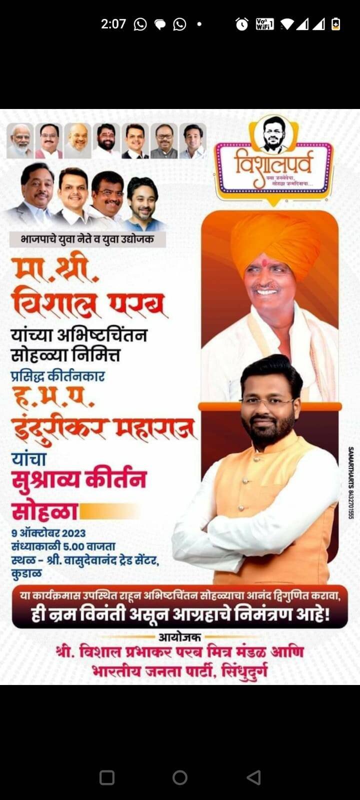 ЁЯО┤рдХреБрдбрд╛рд│,рджрд┐-режрек :- рднрд╛рдЬрдкрдЪреЗ рдорд╣рд╛рд░рд╛рд╖реНрдЯреНрд░рд╛рдЪреЗ рдпреБрд╡рд╛ рдиреЗрддреЗ рддрдерд╛ рдпреБрд╡рд╛ рдЙрджреНрдпреЛрдЬрдХ рд╕рд╛рдорд╛рдЬрд┐рдХ рдХрд╛рд░реНрдпрдХрд░реНрддреЗ рд╡рд┐рд╢рд╛рд▓ рдкрд░рдм рдпрд╛рдВрдЪрд╛ рд╡рд╛рдврджрд┐рд╡рд╕ 15 рдСрдХреНрдЯреЛрдмрд░ 2023 рдореЛрдареНрдпрд╛ рдЙрддреНрд╕рд╛рд╣рд╛рдд рдЖрдгреА рджрд┐рдорд╛рдЦрд╛рдд рд╡рд┐рд╡рд┐рдз рд╕рд╛рдорд╛рдЬрд┐рдХ рд╡ рд╕рд╛рдВрд╕реНрдХреГрддрд┐рдХ рдЙрдкрдХреНрд░рдорд╛рдиреА рдЖрдгреА рдХрд╛рд░реНрдпрдХреНрд░рдорд╛рдиреА рд╕рд╛рдЬрд░рд╛ рд╣реЛрдд рдЖрд╣реЗ.реп рд╕рдкреНрдЯреЗрдВрдмрд░рд▓рд╛ рдкреНрд░рд╕рд┐рджреНрдз рдХреАрд░реНрддрдирдХрд╛рд░ рд╣. рдн. рдк. рдЗрдВрджреБрд░реАрдХрд░ рдорд╣рд╛рд░рд╛рдЬрд╛рдВрдЪреЗ рдХреАрд░реНрддрди рд╣реЛрдгрд╛рд░ рдЕрд╕реВрди 15 рдСрдХреНрдЯреЛрдмрд░рд▓рд╛ рд╕рд╛рд╡рдВрддрд╡рд╛рдбреА рдЬрд┐рдордЦрд╛рдирд╛ рдореИрджрд╛рдирд╛рд╡рд░ рд╕реБрдкреНрд░рд╕рд┐рджреНрдз рдЧрд╛рдпрдХ рдЬреБрдмреАрди рдиреЙрдЯреАрдпрд╛рд▓ рдпрд╛рдВрдЪрд╛ рдмрд╣рд╛рд░рджрд╛рд░ рд╕рдВрдЧреАрддрд╛рдЪрд╛ рдХрд╛рд░реНрдпрдХреНрд░рдо рд╣реЛрдгрд╛рд░ рдЖрд╣реЗ. рдпрд╛рдирд┐рдорд┐рддреНрддрд╛рдиреЗ рд╡рд┐рд╡рд┐рдз рдЙрдкрдХреНрд░рдорд╛рдиреЗ рдЖрдпреЛрдЬрд┐рдд рдЕрд╢рд╛ тАЬрд╡рд┐рд╢рд╛рд▓ рдЕрднрд┐рд╖реНрдЯрдЪрд┐рдВрддрди рд╕реЛрд╣рд│реНрдпрд╛” рдЪреЗ рдЖрдпреЛрдЬрди рдХрд░рдгреНрдпрд╛рдд рдЖрд▓реЗ рдЖрд╣реЗ.