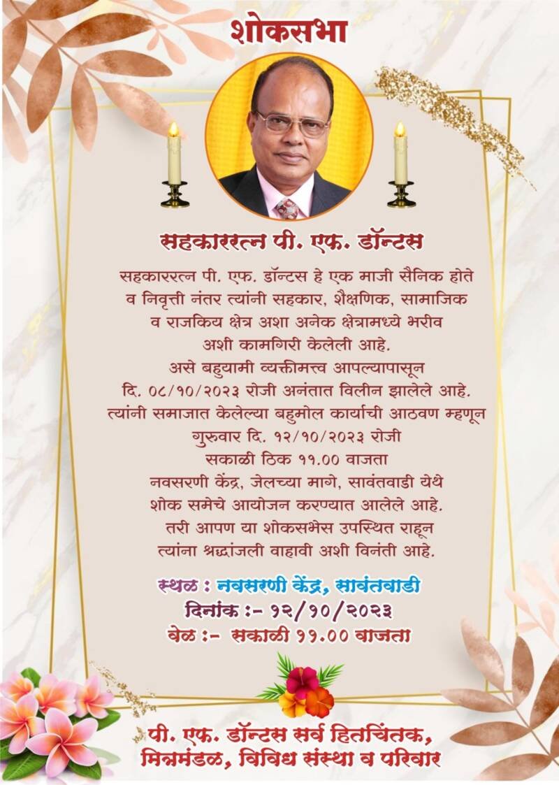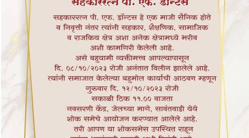 ЁЯО┤рд╕рд╛рд╡рдВрддрд╡рд╛рдбреА, рджрд┐-резреж:– рд╕рд╣рдХрд╛рд░рд░рддреНрди рдкреА. рдПрдл. рдбреЙрдиреНрдЯрд╕ рд╣реЗ рдПрдХ рдорд╛рдЬреА рд╕реИрдирд┐рдХ рд╣реЛрддреЗ рд╡ рдирд┐рд╡реГрддреНрддреАрдирдВрддрд░ рддреНрдпрд╛рдВрдиреА рд╕рд╣рдХрд╛рд░, рд╢реИрдХреНрд╖рдгрд┐рдХ, рд╕рд╛рдорд╛рдЬрд┐рдХ рд╡ рд░рд╛рдЬрдХрд┐рдп рдХреНрд╖реЗрддреНрд░ рдЕрд╢рд╛ рдЕрдиреЗрдХ рдХреНрд╖реЗрддреНрд░рд╛рдордзреНрдпреЗ рднрд░реАрд╡ рдЕрд╢реА рдХрд╛рдордЧрд┐рд░реА рдХреЗрд▓реЗрд▓реА рдЖрд╣реЗ. рдЕрд╕реЗ рдмрд╣реБрдпрд╛рдореА рд╡реНрдпрдХреНрддреАрдорддреНрддреНрд╡ рдЖрдЬ рдЖрдкрд▓реНрдпрд╛рдкрд╛рд╕реВрди рджрд┐. режрео/резреж/реирежреирей рд░реЛрдЬреА рдЕрдирдВрддрд╛рдд рд╡рд┐рд▓реАрди рдЭрд╛рд▓реЗрд▓реЗ рдЖрд╣реЗ. рддреНрдпрд╛рдВрдиреА рд╕рдорд╛рдЬрд╛рдд рдХреЗрд▓реЗрд▓реНрдпрд╛ рдмрд╣реБрдореЛрд▓ рдХрд╛рд░реНрдпрд╛рдЪреА рдЖрдард╡рдг рдореНрд╣рдгреВрди рдЧреБрд░реБрд╡рд╛рд░ рджрд┐. резреи/резреж/реирежреирей рд░реЛрдЬреА рд╕рдХрд╛рд│реА рдард┐рдХ резрез.режреж рд╡рд╛рдЬрддрд╛ рдирд╡рд╕рд░рдгреА рдХреЗрдВрджреНрд░, рдЬреЗрд▓рдЪреНрдпрд╛ рдорд╛рдЧреЗ, рд╕рд╛рд╡рдВрддрд╡рд╛рдбреА рдпреЗрдереЗ рд╢реЛрдХ рд╕рдореЗрдЪреЗ рдЖрдпреЛрдЬрди рдХрд░рдгреНрдпрд╛рдд рдЖрд▓реЗрд▓реЗ рдЖрд╣реЗ. рддрд░реА рдпрд╛ рд╢реЛрдХрд╕рднреЗрд╕ рддрдорд╛рдо рдирд╛рдЧрд░рд┐рдХ рд╡ рд╕реНрдиреЗрд╣реАрдЬрдгрд╛рдВрдиреА рдЙрдкрд╕реНрдерд┐рдд рд░рд╛рд╣реВрди рддреНрдпрд╛рдВрдирд╛ рд╢реНрд░рджреНрдзрд╛рдВрдЬрд▓реА рд╡рд╛рд╣рд╛рд╡реА, рдЕрд╢реА рд╡рд┐рдирдВрддреА, рдкреА. рдПрдл. рдбреЙрдиреНрдЯрд╕ рд╕рд░реНрд╡ рд╣рд┐рддрдЪрд┐рдВрддрдХ, рдорд┐рддреНрд░рдордВрдбрд│, рд╡рд┐рд╡рд┐рдз рд╕рдВрд╕реНрдерд╛ рд╡ рдкрд░рд┐рд╡рд╛рд░ рдпрд╛рдВрдиреА рдХреЗрд▓реА рдЖрд╣реЗ.