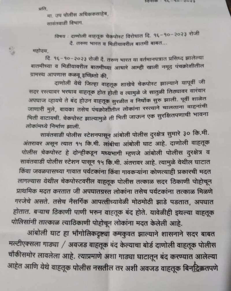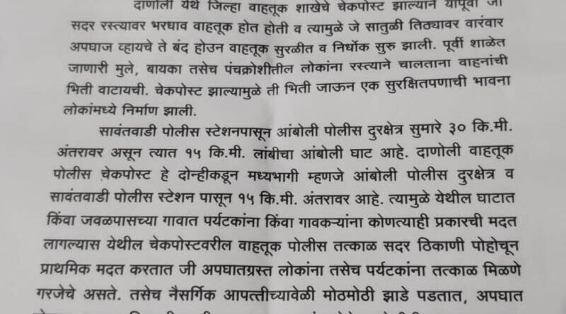 рддрд░реА рдЖрдореНрд╣реА рдЦрд╛рд▓реА рдирдореВрдж рдЧрд╛рд╡рд╛рддреАрд▓ рдЧреНрд░рд╛рдорд╕реНрде рдЖрдкрдгрд╛рд╕ рд╡рд┐рдирдВрддреА рдХрд░рддреЛ рдХреА, рджрд╛рдгреЛрд▓реА рддрд┐рдард╛ рд╡рд╛рд╣рддреВрдХ рдкреЛрд▓реАрд╕ рдЪреМрдХреА рдмрдВрдж рдХрд░рдгреНрдпрд╛рдмрд╛рдмрдд рдЧрд╛рд╡рд╛рддреАрд▓ рдХреЛрдгреАрд╣реА, рдХрдзреАрд╣реА рдорд╛рдЧрдгреА рдХреЗрд▓реЗрд▓реА рдирд╕реВрди рдХреЛрдгреАрддрд░реА рдмрд╛рд╣реЗрд░рдЪреНрдпрд╛ рдЗрд╕рдорд╛рдиреЗ рдЕрд╢реА рдорд╛рдЧрдгреА рдХреЗрд▓реЗрд▓реА рджрд┐рд╕рддреЗ. рддреА рддреНрдпрд╛рдВрдиреА рдХрд╛ рдХреЗрд▓реА рдпрд╛рдмрд╛рдмрддрдЪ рд╡реЗрдЧрд│рд╛рдЪрд╛ рд╕рдВрд╢рдп рдпреЗрдд рдЕрд╕реВрди рд╕рджрд░ рдЪреМрдХреАрд╡рд░ рдХрд╛рдо рдХрд░рдгрд╛рд▒реНрдпрд╛ рдкреЛрд▓рд┐рд╕рд╛рдВрдЪрд╛ рдкрдВрдЪрдХреНрд░реЛрд╢реАрддреАрд▓ рдирд╛рдЧрд░реАрдХрд╛рдВрдирд╛ рдХрд┐рдВрд╡рд╛ рдкрд░реНрдпрдЯрдХрд╛рдВрдирд╛ рдЖрдЬрдкрд░реНрдпрдВрдд рдХрдзреАрд╣реА рддреНрд░рд╛рд╕ рдЭрд╛рд▓реЗрд▓рд╛ рдирд╕реВрди рдЙрд▓рдЯ рдпреЗрдереАрд▓ рдЪреМрдХреАрдореБрд│реЗ рд▓реЛрдХрд╛рдВрдордзреНрдпреЗ рд╡ рдкрд░реНрдпрдЯрдХрд╛рдВрдордзреНрдпреЗ рд╕реБрд░рдХреНрд╖рд┐рддрддреЗрдЪреА рднрд╛рд╡рдирд╛ рдирд┐рд░реНрдорд╛рдг рдЭрд╛рд▓реЗрд▓реА рдЕрд╕реВрди рд▓реЛрдХрд╛рдВрдЪреНрдпрд╛ рднрд╛рд╡рдирд╛рдВрдЪрд╛ рдЖрджрд░ рдХрд░реБрди рджрд╛рдгреЛрд▓реА рддрд┐рдард╛ рд╡рд╛рд╣рддреБрдХ рдкреЛрд▓реАрд╕ рдЪреМрдХреА рдХрд╛рдпрдорд╕реНрд╡рд░реБрдкреА рд╕реБрд░реБ рдареЗрд╡рд╛рд╡реА рдЕрд╢реА рдЖрдордЪреА рдорд╛рдЧрдгреА рдЖрд╣реЗ.рдпрд╛ рдирд┐рд╡реЗрджрдирд╛рд╡рд░ рд░рд╛рдШреЛрдЬреА рд╕рд╛рд╡рдВрдд , рддреБрдХрд╛рд░рд╛рдо рдЬрдВрдЧрд▓реЗ,рд╕реБрд╣рд╛рд╕ рддреЗрдЬрдо, рд╕реБрдиреАрд▓ рд╕рд╛рд╡рдВрдд,рдЕрдирд┐рд▓ рд╕рд╛рд╡рдВрдд,рд╡рд┐рдЬрдп рдкрд░рдм,рдорджрди рдкрд░рдм,рдкрдВрдХрдЬ рдкрд░рдм,рд▓рд╡реВ рд▓рдЯрдо,рдорд╣рд╛рджреЗрд╡ рд╕рд╛рд╡рдВрдд,рд░реАрддреЗрд╢ рдХрд▓рд╛рдВрдЧрдг, рдкреНрд░рд╢рд╛рдВрдд рд╕реБрдХреА рдЖрджреА рд╕рд╣ рд╢реЗрдХрдбреЛ рдЧреНрд░рд╛рдорд╕реНрдерд╛рдВрдиреА рд╕рд╣реНрдпрд╛ рдХреЗрд▓реНрдпрд╛ рдЖрд╣реЗрдд,