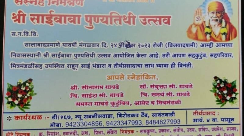 рдЧреЗрд▓реА рд╕рд╡реНрд╡реАрд╕ рд╡рд░реНрд╖реЗ рд╕реАрддрд╛рд░рд╛рдо рдЧрд╛рд╡рдбреЗ рдпрд╛рдВрдЪреНрдпрд╛ рдирд┐рд╡рд╛рд╕рд╕реНрдерд╛рдиреА рд╕рд╛рдИрдмрд╛рдмрд╛ рдкреБрдгреНрдпрддрд┐рдереА рдЙрддреНрд╕рд╡ рд╕рд╛рдЬрд░рд╛ рдХрд░рдгреНрдпрд╛рдд рдпреЗрддреЛ, рджреБрдкрд╛рд░реА рдорд╣рд╛рдкреНрд░рд╕рд╛рдж рд╡ рд╕рдВрдзреНрдпрд╛рдХрд╛рд│реА рдЪрд╛рд░ рд╡рд╛рдЬрд▓реНрдпрд╛рдкрд╛рд╕реВрди рдЭреБрдгрдХрд╛ рднрд╛рдХрд░ рдЪрд╛ рдкреНрд░рд╕рд╛рдж рднрд╛рд╡рд┐рдХрд╛рдВрдирд╛ рд╡рд╛рдЯрдк рдХрд░рдгреНрдпрд╛рдд рдпреЗрддреЛ,рд░рд╛рддреНрд░реЛ рднрдЬрдирд╛рдЪрд╛ рдХрд╛рд░реНрдпрдХреНрд░рдо рд╕рдВрдкрдиреНрди рд╣реЛрддреЛ,рддрд░реА рд╕рд░реНрд╡ рднрд╛рд╡рд┐рдХрд╛рдВрдиреА рдпрд╛рдЪрд╛ рд▓рд╛рдн рдШреНрдпрд╛рд╡рд╛ рдЕрд╕реЗ рдЖрд╡рд╛рд╣рди рдХрд░рдгреНрдпрд╛рдд рдЖрд▓реЗ рдЖрд╣реЗ.