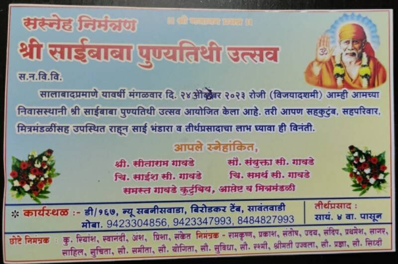 ЁЯЯе рд╕рд╛рдИрднрдХреНрдд рд╕реАрддрд╛рд░рд╛рдо рдЧрд╛рд╡рдбреЗ рдпрд╛рдВрдЪреНрдпрд╛ рдирд┐рд╡рд╛рд╕рд╕реНрдерд╛рдиреА реирек рд░реЛрдЬреА рд╕рд╛рдЬрд░рд╛ рд╣реЛрдгрд╛рд░ рд╕рд╛рдИрдмрд╛рдмрд╛ рдкреБрдгреНрдпрддрд┐рдереА рдЙрддреНрд╕рд╡..