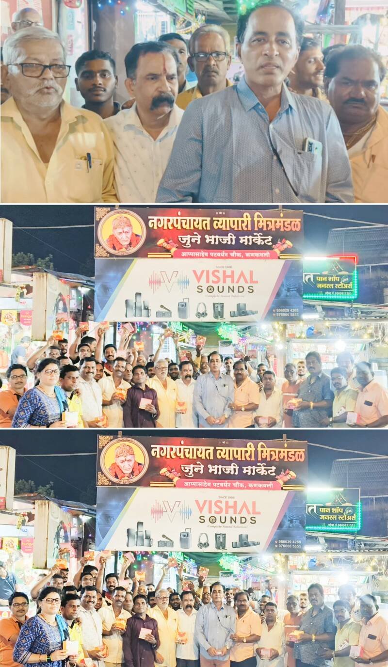 ЁЯО┤рдХрдгрдХрд╡рд▓реА, рджрд┐-резрел рдиреЛрд╡реНрд╣реЗрдВрдмрд░:- рд░реЛрдЬреА рдкрдЯрд╡рд░реНрдзрди рдЪреМрдХ рдпреЗрдереЗ рдЕрд╕рдгрд╛рд░реЗ рдирдЧрд░рдкрдВрдЪрд╛рдпрдд рднрд╛рдЬреА рдорд╛рд░реНрдХреЗрдЯрдордзреАрд▓ рд╕рд░реНрд╡ рдмрдВрдзреБ рдЖрдгрд┐ рднрдЧрд┐рдиреАрдВрдирд╛, рддрд╕реЗрдЪ рд╡реНрдпрд╛рдкрд╛рд░реА рдорд┐рддреНрд░рдВрдбрд│реАрдВрдирд╛ рд╕рдВрдЬрдп рдорд╛рд▓рдВрдбрдХрд░, рдорд╣реЗрд╢ рдХрд╛рдгреЗрдХрд░, рд╕реБрдирд┐рд▓ рдХрд╛рдгреЗрдХрд░, рднрд╛рдИ рдХрд╛рдгреЗрдХрд░, рдкреА. рдЯреА. рдЪрд╡реНрд╣рд╛рдг рдпрд╛рдВрдЪреНрдпрд╛ рдиреЗрддреГрддреНрд╡рд╛рдЦрд╛рд▓реА рд╕рдорд╕реНрдд рд╡реНрдпрд╛рдкрд╛рд░реА рд╡рд░реНрдЧрд╛рд▓рд╛ рд░рд╛рдЬреЗрдВрджреНрд░ рдордиреЛрд╣рд░ рдкреЗрдбрдгреЗрдХрд░ рдпрд╛рдВрдЪреНрдпрд╛ реиреж/режрез/реирежреирек рдордзреНрдпреЗ рдпреЗрдгрд╛рд▒реНрдпрд╛ рд╡рд╛рдврджрд┐рд╡рд╕рд╛рдЪреЗ рдФрдЪрд┐рддреНрдп рд╕рд╛рдзрдд, рджрд┐рдкрд╛рд╡рд▓реА рдкрд╛рдбрд╡реНрдпрд╛рд▓рд╛ рд╕рд░реНрд╡рд╛рдВрдЪреЗ рддреЛрдВрдб рдЧреЛрдб рдХреЗрд▓реЗ.