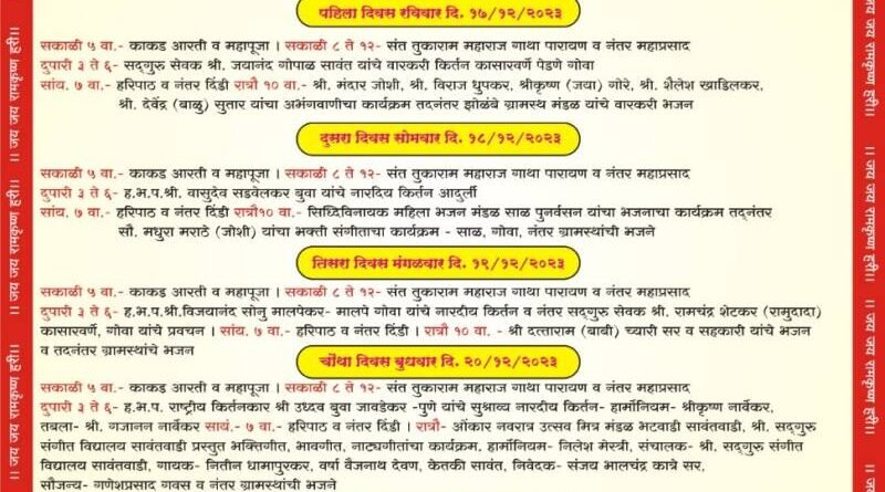 рд╕рдХрд╛рд│реА рел рд╡рд╛.- рдХрд╛рдХрдб рдЖрд░рддреА рд╡ рдорд╣рд╛рдкреВрдЬрд╛ред рд╕рдХрд╛рд│реА рео рддреЗ резреи- рд╕рдВрдд рддреБрдХрд╛рд░рд╛рдо рдорд╣рд╛рд░рд╛рдЬ рдЧрд╛рдерд╛ рдкрд╛рд░рд╛рдпрдг рд╡ рдирдВрддрд░ рдорд╣рд╛рдкреНрд░рд╕рд╛рдж рджреБрдкрд╛рд░реА рей рддреЗ рем- рд╣.рдн.рдк. рд░рд╛рд╖реНрдЯреНрд░реАрдп рдХрд┐рд░реНрддрдирдХрд╛рд░ рд╢реНрд░реА рдЙрдзреНрджрд╡ рдмреБрд╡рд╛ рдЬрд╛рд╡рдбреЗрдХрд░ – рдкреБрдгреЗ рдпрд╛рдВрдЪреЗ рд╕реБрд╢реНрд░рд╛рд╡реНрдп рдирд╛рд░рджреАрдп рдХрд┐рд░реНрддрди рд╣рд╛рд░реНрдореЛрдирд┐рдпрдо- рд╢реНрд░реАрдХреГрд╖реНрдг рдирд╛рд░реНрд╡реЗрдХрд░, рддрдмрд▓рд╛- рд╢реНрд░реА. рдЧрдЬрд╛рдирди рдирд╛рд░реНрд╡реЗрдХрд░ рд╕рд╛рдпрдВ. рен рд╡рд╛. рд╣рд░рд┐рдкрд╛рда рд╡ рдирдВрддрд░ рджрд┐рдВрдбреА ред рд░рд╛рддреНрд░реМ рдУрдВрдХрд╛рд░ рдирд╡рд░рд╛рддреНрд░ рдЙрддреНрд╕рд╡ рдорд┐рддреНрд░ рдордВрдбрд│ рднрдЯрд╡рд╛рдбреА рд╕рд╛рд╡рдВрддрд╡рд╛рдбреА, рд╢реНрд░реА. рд╕рджреНрдЧреБрд░реБ рд╕рдВрдЧреАрдд рд╡рд┐рджреНрдпрд╛рд▓рдп рд╕рд╛рд╡рдВрддрд╡рд╛рдбреА рдкреНрд░рд╕реНрддреБрдд рднрдХреНрддрд┐рдЧреАрдд, рднрд╛рд╡рдЧреАрдд, рдирд╛рдЯреНрдпрдЧреАрддрд╛рдВрдЪрд╛ рдХрд╛рд░реНрдпрдХреНрд░рдо, рд╣рд╛рд░реНрдореЛрдирд┐рдпрдо рдирд┐рд▓реЗрд╢ рдореЗрд╕реНрддреНрд░реА, рд╕рдВрдЪрд╛рд▓рдХ рд╢реНрд░реА. рд╕рджреНрдЧреБрд░реБ рд╕рдВрдЧреАрдд рд╡рд┐рджреНрдпрд╛рд▓рдп рд╕рд╛рд╡рдВрддрд╡рд╛рдбреА, рдЧрд╛рдпрдХ- рдирд┐рддреАрди рдзрд╛рдорд╛рдкреБрд░рдХрд░, рд╡рд░реНрд╖рд╛ рд╡реИрдЬрдирд╛рде рджреЗрд╡рдг, рдХреЗрддрдХреА рд╕рд╛рд╡рдВрдд, рдирд┐рд╡реЗрджрдХ рд╕рдВрдЬрдп рднрд╛рд▓рдЪрдВрджреНрд░ рдХрд╛рддреНрд░реЗ рд╕рд░, рд╕реМрдЬрдиреНрдп- рдЧрдгреЗрд╢рдкреНрд░рд╕рд╛рдж рдЧрд╡рд╕ рд╡ рдирдВрддрд░ рдЧреНрд░рд╛рдорд╕реНрдерд╛рдВрдЪреА рднрдЬрдиреЗ