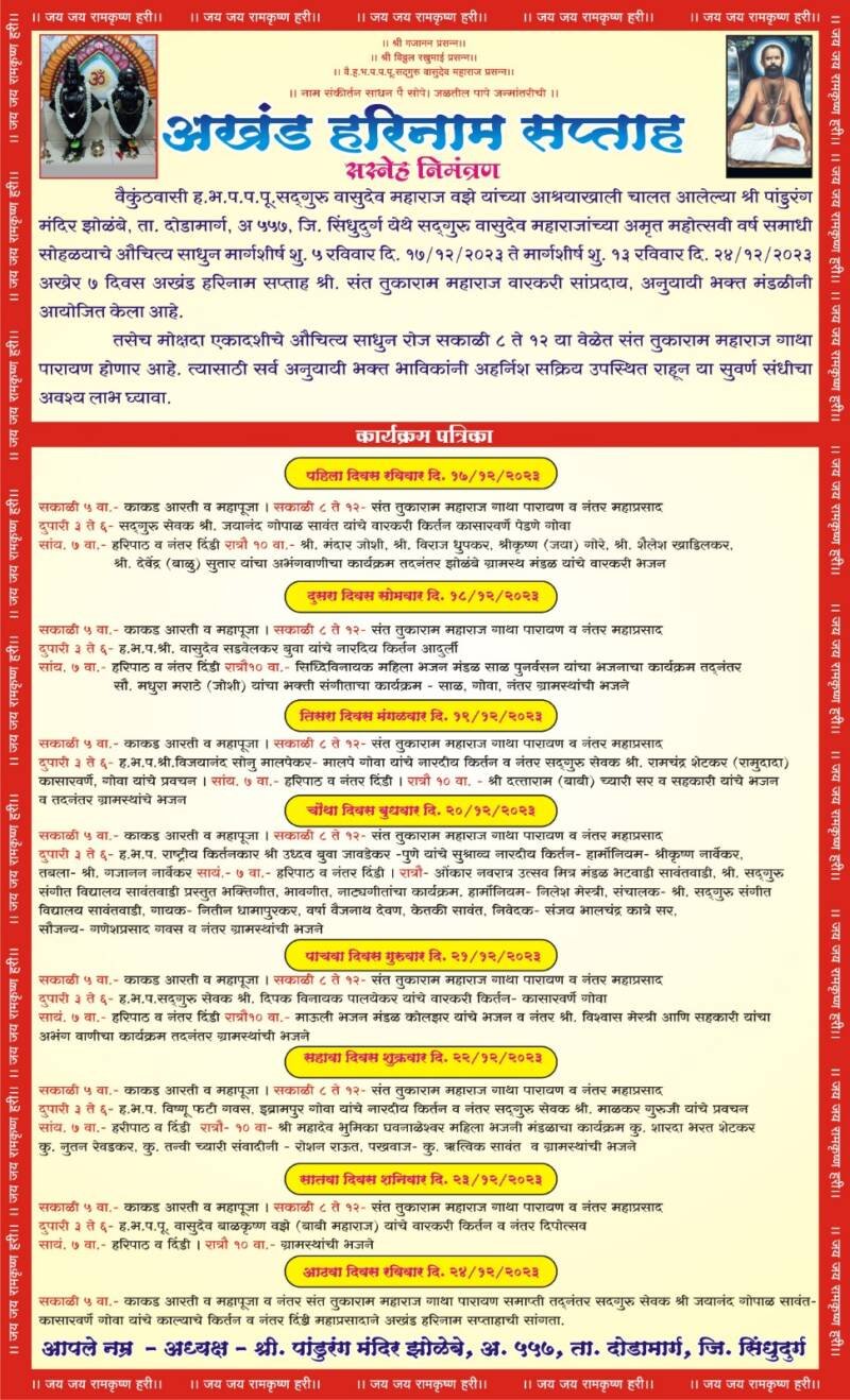 ЁЯО┤рджреЛрдбрд╛рдорд╛рд░реНрдЧ, рджрд┐-резрел:- рд╡реИрдХреБрдВрдард╡рд╛рд╕реА рд╣.рдн.рдк.рдк. рдкреВ. рд╕рджреНрдЧреБрд░реБ рд╡рд╛рд╕реБрджреЗрд╡ рдорд╣рд╛рд░рд╛рдЬ рд╡рдЭреЗ рдпрд╛рдВрдЪреНрдпрд╛ рдЖрд╢реНрд░рдпрд╛рдЦрд╛рд▓реА рдЪрд╛рд▓рдд рдЖрд▓реЗрд▓реНрдпрд╛ рд╢реНрд░реА рдкрд╛рдВрдбреБрд░рдВрдЧ рдордВрджрд┐рд░ рдЭреЛрд│рдВрдмреЗ, рддрд╛. рджреЛрдбрд╛рдорд╛рд░реНрдЧ, рдЕ релрелрен, рдЬрд┐. рд╕рд┐рдВрдзреБрджреБрд░реНрдЧ рдпреЗрдереЗ рд╕рджреНрдЧреБрд░реБ рд╡рд╛рд╕реБрджреЗрд╡ рдорд╣рд╛рд░рд╛рдЬрд╛рдВрдЪреНрдпрд╛ рдЕрдореГрдд рдорд╣реЛрддреНрд╕рд╡реА рд╡рд░реНрд╖ рд╕рдорд╛рдзреА рд╕реЛрд╣рд│реНрдпрд╛рдЪреЗ рдФрдЪрд┐рддреНрдп рд╕рд╛рдзреБрди рдорд╛рд░реНрдЧрд╢реАрд░реНрд╖ рд╢реБ. рел рд░рд╡рд┐рд╡рд╛рд░ рджрд┐. резрен/резреи/реирежреирей рддреЗ рдорд╛рд░реНрдЧрд╢реАрд░реНрд╖ рд╢реБ. резрей рд░рд╡рд┐рд╡рд╛рд░ рджрд┐. реирек/резреи/реирежреирей рдЕрдЦреЗрд░ рен рджрд┐рд╡рд╕ рдЕрдЦрдВрдб рд╣рд░рд┐рдирд╛рдо рд╕рдкреНрддрд╛рд╣ рд╢реНрд░реА. рд╕рдВрдд рддреБрдХрд╛рд░рд╛рдо рдорд╣рд╛рд░рд╛рдЬ рд╡рд╛рд░рдХрд░реА рд╕рд╛рдВрдкреНрд░рджрд╛рдп, рдЕрдиреБрдпрд╛рдпреА рднрдХреНрдд рдордВрдбрд│реАрдиреА рдЖрдпреЛрдЬрд┐рдд рдХреЗрд▓рд╛ рдЖрд╣реЗ.
