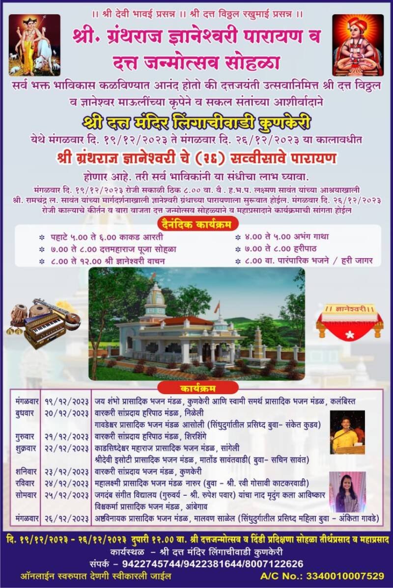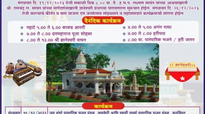 ЁЯО┤рд╕рд╛рд╡рдВрддрд╡рд╛рдбреА, рджрд┐-резреп:- рдХреБрдгрдХреЗрд░реА-рд▓рд┐рдВрдЧрд╛рдЪреАрд╡рд╛рдбреА рдпреЗрдереАрд▓ рджрддреНрдд рдордВрджрд┐рд░рд╛рдд рдЖрдЬ резреп рдбрд┐рд╕реЗрдВрдмрд░рдкрд╛рд╕реВрди реирем рд╕рд╛рд╡реНрдпрд╛ рд╢реНрд░реА рдЧреНрд░рдВрдерд░рд╛рдЬ рдЬреНрдЮрд╛рдиреЗрд╢реНрд╡рд░реА рдкрд╛рд░рд╛рдпрдгрд╛рдЪреЗ рдЖрдпреЛрдЬрди рдХрд░рдгреНрдпрд╛рдд рдЖрд▓реЗ рдЖрд╣реЗ. рджрддреНрдд рдЬрдпрдВрддреА рджрд┐рд╡рд╢реА. рдордВрдЧрд│рд╡рд╛рд░ реирем рдбрд┐рд╕реЗрдВрдмрд░рд▓рд╛ рдпрд╛ рдкрд╛рд░рд╛рдпрдгрд╛рдЪреА рд╕рд╛рдВрдЧрддрд╛ рд╣реЛрдгрд╛рд░ рдЖрд╣реЗ. рдордВрдЧрд│рд╡рд╛рд░реА рд╕рдХрд╛рд│реА рдЖрда рд╡рд╛рдЬрддрд╛ рд░рд╛рдордЪрдВрджреНрд░ рд╕рд╛рд╡рдВрдд рдпрд╛рдВрдЪреНрдпрд╛ рдорд╛рд░реНрдЧрджрд░реНрд╢рдирд╛рдЦрд╛рд▓реА рдпрд╛ рдкрд╛рд░рд╛рдпрдгрд╛рд╕ рдкреНрд░рд╛рд░рдВрдн рд╣реЛрдгрд╛рд░ рдЖрд╣реЗ. рдпрд╛рдирд┐рдорд┐рддреНрдд рджрддреНрдд рдордВрджрд┐рд░рд╛рдд рджрд░рд░реЛрдЬ рдкрд╣рд╛рдЯреЗ рек рд╡рд╛рдЬрддрд╛ рдЕрднрдВрдЧ рдЧрд╛рдерд╛, рддреНрдпрд╛рдирдВрддрд░ рдкрд╣рд╛рдЯреЗ рел рдмрд╛рдЬрддрд╛ рдХрд╛рдХрдб рдЖрд░рддреА, рд╕рдХрд╛рд│реА рен рд╡рд╛рдЬрддрд╛ рд╢реНрд░реА рджрддреНрдд рдорд╣рд╛рд░рд╛рдЬ рдкреВрдЬрди рд╕реЛрд╣рд│рд╛ рдЖрдгрд┐ рд╣рд░рд┐рдкрд╛рда, рд╕рдХрд╛рд│реА рео рд╡рд╛рдЬрд▓реНрдпрд╛рдкрд╛рд╕реВрди рд╢реНрд░реА рдЬреНрдЮрд╛рдиреЗрд╢реНрд╡рд░реА рд╡рд╛рдЪрди, рддрд╕реЗрдЪ рдкрд╛рд░рдВрдкрд░рд┐рдХ рднрдЬрдиреЗ рд╣реЛрдгрд╛рд░ рдЖрд╣реЗрдд рдордВрдЧрд│рд╡рд╛рд░ резреп рдбрд┐рд╕реЗрдВрдмрд░ рд░реЛрдЬреА рдХреБрдгрдХреЗрд░реА-рд▓рд┐рдЧрд╛рдЪреАрд╡рд╛рдбреА рдпреЗрдереАрд▓ рдЬрдп рд╢рдВрднреЛ рдкреНрд░рд╛рд╕рд╛рджрд┐рдХ рднрдЬрди рдордВрдбрд│ рдЖрдгрд┐ рдХрд▓рдВрдмрд┐рд╕реНрдд рдпреЗрдереАрд▓ рд╕реНрд╡рд╛рдореА рд╕рдорд░реНрде рднрдЬрди рдордВрдбрд│рд╛рдЪреЗ рднрдЬрди рд╣реЛрдгрд╛рд░ рдЖрд╣реЗ рдмреБрдзрд╡рд╛рд░ реиреж рдбрд┐рд╕реЗрдВрдмрд░рд▓рд╛ рдирд┐рд│реЗрд▓реА рд╡рд╛рд░рдХрд░реА рд╕рдВрдкреНрд░рджрд╛рдп рдЖрдгрд┐ рдЖрд╕реЛрд▓реА рдЧрд╛рд╡рдбреЗрд╢реНрд╡рд░ рдкреНрд░рд╛рд╕рд╛рджрд┐рдХ рднрдЬрди рдордВрдбрд│рд╛рдЪреЗ рднрдЬрди рд╣реЛрдгрд╛рд░ рдЖрд╣реЗ. рдЧреБрд░реБрд╡рд╛рд░ реирез рдбрд┐рд╕реЗрдВрдмрд░рд▓рд╛ рд╢рд┐рд░рд╢рд┐рдВрдЧреЗ рд╡рд╛рд░рдХрд░реА рд╕рдВрдкреНрд░рджрд╛рдпрд╛рдЪрд╛ рд╣рд░рд┐рдкрд╛рда рд╣реЛрдгрд╛рд░ рдЖрд╣реЗ. рд╢реБрдХреНрд░рд╡рд╛рд░ реиреи рдбрд┐рд╕реЗрдВрдмрд░рд▓рд╛ рд╕рд╛рдВрдЧреЗрд▓реА рдХрд╛рдбрд╕рд┐рджреНрдзреЗрд╢реНрд╡рд░ рднрдЬрди рдордВрдбрд│ рдЖрдгрд┐ рдорд╛рддреЛрдВрдб рд╢реНрд░реА рдЗрд╕реЛрдЯреА рдкреНрд░рд╛рд╕рд╛рджрд┐рдХ рднрдЬрди рдордВрдбрд│рд╛рдЪрд╛ рдХрд╛рд░реНрдпрдХреНрд░рдо рд╣реЛрдгрд╛рд░ рдЖрд╣реЗ. рд╢рдирд┐рд╡рд╛рд░ реирей рдбрд┐рд╕реЗрдВрдмрд░рд▓рд╛ рдХреБрдгрдХреЗрд░реА рдирд┐рд│реЗрд▓реА рд╡рд╛рд░рдХрд░реА рд╕рдВрдкреНрд░рджрд╛рдпрд╛рдЪрд╛ рдХрд╛рд░реНрдпрдХреНрд░рдо рддрд░ рд░рд╡рд┐рд╡рд╛рд░ реирек рдбрд┐рд╕реЗрдВрдмрд░рд▓рд╛ рдирд╛рд░реБрд░ рд╢реНрд░реА рдорд╣рд╛рд▓рдХреНрд╖реНрдореА рдкреНрд░рд╛рд╕рд╛рджрд┐рдХ рднрдЬрди рдордВрдбрд│рд╛рдЪрд╛ рдХрд╛рд░реНрдпрдХр