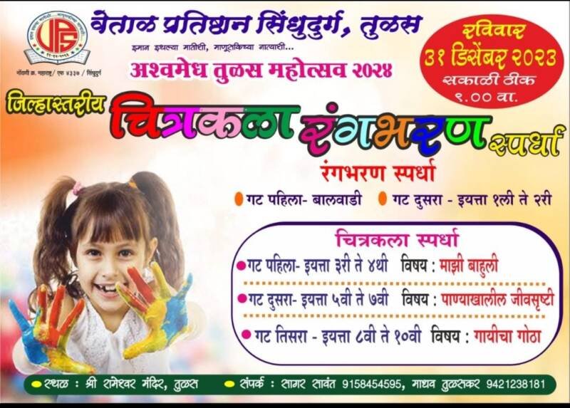 ЁЯО┤рд╡реЗрдВрдЧреБрд░реНрд▓реЗ, рджрд┐-реиреж:– рд╡реЗрддрд╛рд│ рдкреНрд░рддрд┐рд╖реНрдард╛рди рд╕рд┐рдВрдзреБрджреБрд░реНрдЧ рддреБрд│рд╕ рдЖрдпреЛрдЬрд┐рдд рд░рд╡рд┐рд╡рд╛рд░ рджрд┐рдирд╛рдВрдХ рейрез рдбрд┐рд╕реЗрдВрдмрд░ реирежреирей рд░реЛрдЬреА рд╕рдХрд╛рд│реА реп.режреж рд╡рд╛ рд╢реНрд░реА рд░рд╛рдореЗрд╢реНрд╡рд░ рдордВрджрд┐рд░ рддреБрд│рд╕ рдпреЗрдереЗ рдЦреБрд▓реНрдпрд╛ рдЪрд┐рддреНрд░рдХрд▓рд╛ рд╡ рд░рдВрдЧрднрд░рдг рд╕реНрдкрд░реНрдзреЗрдЪреЗ рдЖрдпреЛрдЬрди рдХрд░рдгреНрдпрд╛рдд рдЖрд▓реЗрд▓рдВ рдЖрд╣реЗ.
