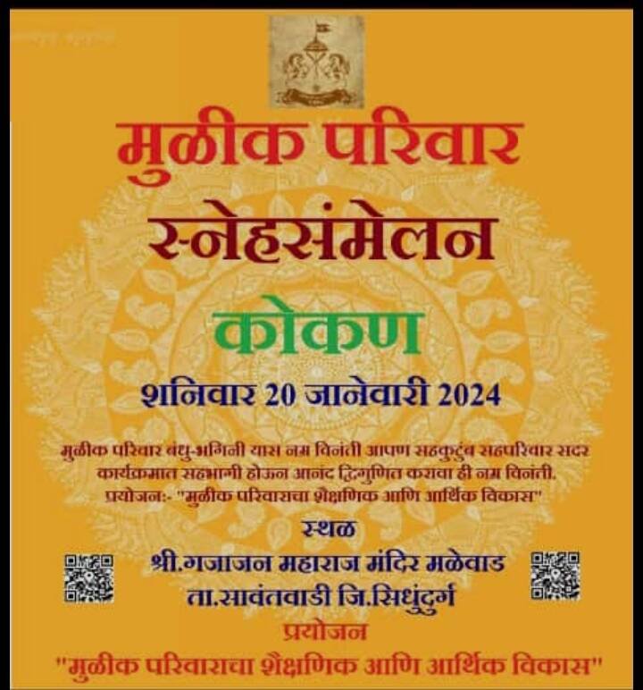 *🎴 मळेवाड, दि.१९*:-मुळीक परिवार बांधवांचे पाचवे स्नेहसंमेलन मळेवाड श्री गजानन महाराज मंदिरात शनिवार २० जानेवारीला सकाळी १० ते सायंकाळी ६ वाजेपर्यंत विविध सांस्कृतिक, सामाजिक, ऐतिहासिक कार्यक्रमांनी साजरे होणार आहे. १९ जानेवारीला गजानन महाराज मंदिरात ऐतिहासिक शिवकालीन शस्त्र प्रदर्शन आयोजित केले आहे.सदर प्रदर्शन २० जानेवारीला सर्वांसाठी खुले असणारे असून सकाळी दहा ते रात्री नऊ वाजेपर्यंत या प्रदर्शनाचा लाभ घेता येणार आहे. २० जानेवारीला सकाळी १० वाजता स्नेहसंमेलनाचे उद्घाटन होणार आहे. त्यानंतर धाकोरे येथील फुगडी कार्यक्रम, त्यानंतर केशव महाराज मुळीक यांचे कीर्तन, भजन, लोकनाट्य, मळेवाड येथील मुळीक बालकलाकार यांचे लोककला, कोकण लोककलेवर आधारित ट्रिकसीनयुक्त ‘ब्रम्हपदार्थ अर्थात महिमा जगन्नाथ पुरीचा’ हे नाटक होणार आहे.२० जानेवारीला सायंकाळी ४ वाजता उपस्थित मुळीक बांधवांचा सन्मान होणार आहे. मळेवाड, कोंडुरा, आजगाव यांच्यावतीने हा स्नेह मेळावा घेतला जात आहे. आतापर्यंत या समाजाचे स्नेहसंमेलन कोकणाबाहेर घेतले जात होते. यंदा प्रथमच सिंधुदुर्गात मळेवाड भागाला संधी देण्यात आली आहे.