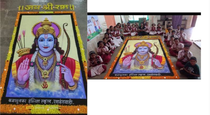 कळसुलकर इंग्लिश स्कूल सावंतवाडी येथे विद्यार्थ्यांच्या चिमुकल्या हातातून साकारलेली नऊ बाय सहा फूट आकाराची श्री राम प्रभूंची रांगोळी