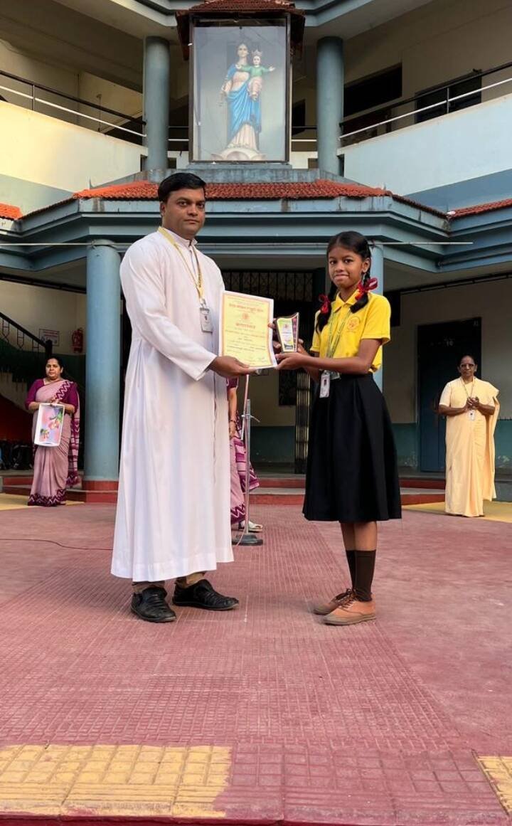 *🎴सावंतवाडी, दि- २५*:-वेताळ प्रतिष्ठान तुळस आयोजित नृत्य स्पर्धेमध्ये मिलाग्रिस प्रशालेच्या काव्या गावडे हिने तृतीय क्रमांक मिळविला आहे. प्रशालेचे मुख्याध्यापक फादर रिचर्ड सालदान्हा यांनी प्रशस्तीपत्र व सन्मानचिन्ह देऊन या विद्यार्थिनीचा गौरव केला. यावेळी प्रशालेच्या उप मुख्याध्यापिका सिस्टर मेबल कार्व्हालो,पर्यवेक्षिका सौ.मेघना राऊळ तसेच सर्व शिक्षक व शिक्षकेतर कर्मचारी उपस्थित होते.