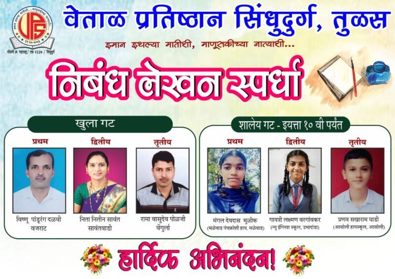 ЁЯО┤рд╡реЗрдВрдЧреБрд░реНрд▓реЗ, рджрд┐-режреи:– рд╡реЗрддрд╛рд│ рдкреНрд░рддрд┐рд╖реНрдард╛рди рд╕рд┐рдВрдзреБрджреБрд░реНрдЧ рддреБрд│рд╕ рдЪреНрдпрд╛ рд╡рддреАрдиреЗ рд╕рд▓рдЧ рджрд╣рд╛рд╡реНрдпрд╛ рд╡рд░реНрд╖реА рд▓рд┐рд╣рд┐рддреНрдпрд╛ рд╣рд╛рддрд╛рдирд╛ рд╡реНрдпрд╛рд╕рдкреАрда рдорд┐рд│рд╛рд╡реЗ рдореНрд╣рдгреВрди рдЦреБрд▓реНрдпрд╛ рдЖрдгрд┐ рд╢рд╛рд▓реЗрдп рдЧрдЯрд╛рдд рдирд┐рдмрдВрдз рд╕реНрдкрд░реНрдзрд╛ рдЖрдпреЛрдЬрд┐рдд рдХрд░рдгреНрдпрд╛рдд рдЖрд▓реА рд╣реЛрддреА. рджреЛрдиреНрд╣реА рд╕реНрдкрд░реНрдзреЗрдд рдЕрдЧрджреА рд╕рдВрдкреВрд░реНрдг рдорд╣рд╛рд░рд╛рд╖реНрдЯреНрд░ рдордзреВрди рдЙрддреНрд╕реНрдлреВрд░реНрдд рдкреНрд░рддрд┐рд╕рд╛рдж рдорд┐рд│рд╛рд▓рд╛. рд╕рд┐рдВрдзреБрджреБрд░реНрдЧрд╕рд╣ рдЕрдЧрджреА рдореБрдмрдИ, рдкреБрдгреЗ, рд╕рдВрднрд╛рдЬреАрдирдЧрд░, рдХреЛрд▓реНрд╣рд╛рдкреВрд░,рдЧреЛрд╡рд╛,рд╕рд╛рддрд╛рд░рд╛,рдкреБрдгреЗ, рдирд╛рд╢рд┐рдХ рд╢рд┐рд░реНрдбреА, рдЬрд│рдЧрд╛рд╡, рд░рддреНрдирд╛рдЧрд┐рд░реА, рдЕрд╣рдорджрдирдЧрд░ рдЖрджреА рдареАрдХрд╛рдгрд╛рд╣реВрди рд╕реНрдкрд░реНрдзрдХ рд╕рд╣рднрд╛рдЧреА рдЭрд╛рд▓реЗ.