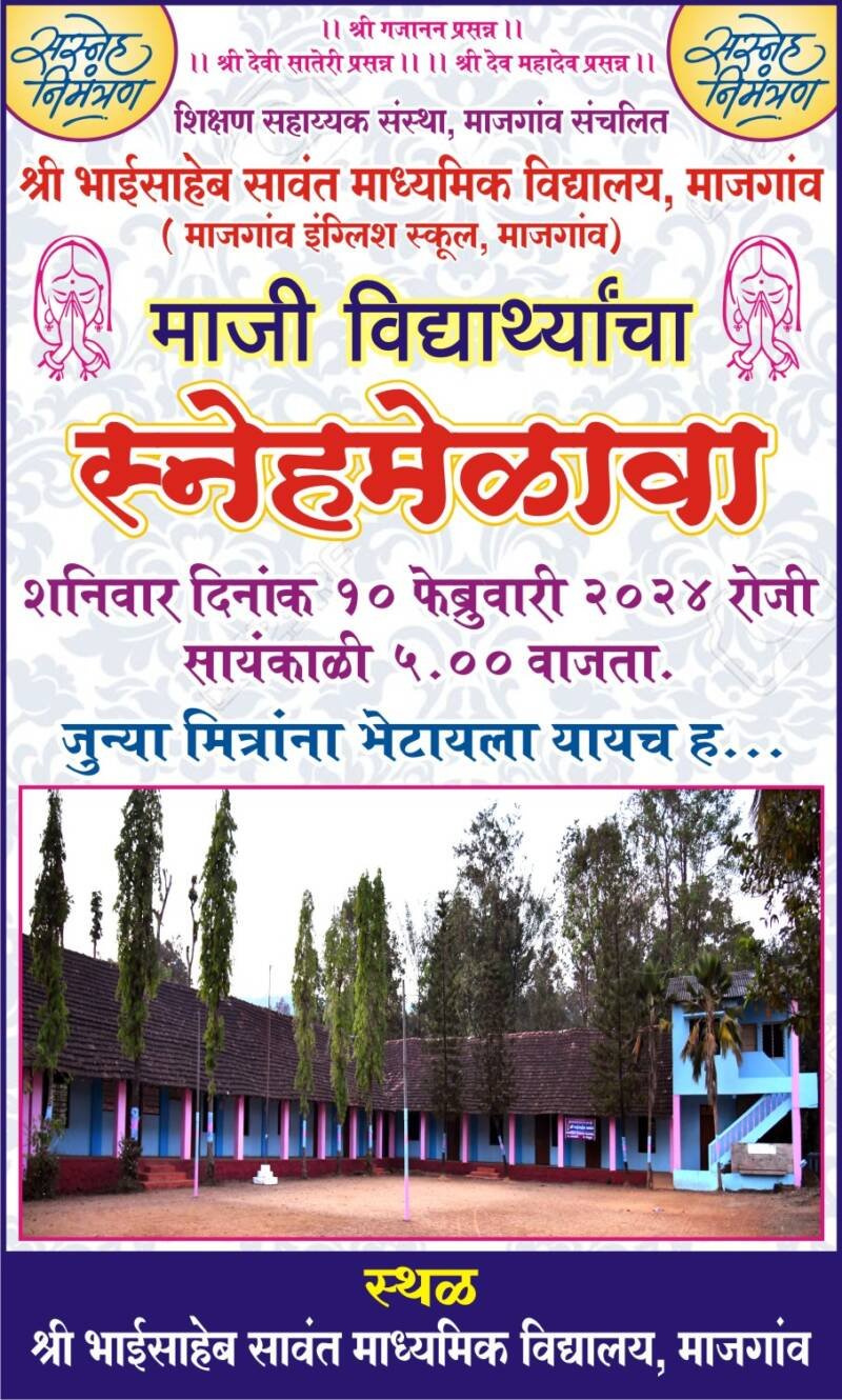 ЁЯЯе рд╢реНрд░реА рднрд╛рдИрд╕рд╛рд╣реЗрдм рд╕рд╛рд╡рдВрдд рдорд╛рдзреНрдпрдорд┐рдХ рд╡рд┐рджреНрдпрд╛рд▓рдп, рдорд╛рдЬрдЧрд╛рдВрд╡ рдкреНрд░рд╢рд╛рд▓реЗрдЪрд╛ рд╕рд░реНрд╡ рдорд╛рдЬреА рд╡рд┐рджреНрдпрд╛рд░реНрдереНрдпрд╛рдВрдЪрд╛ резреж рд░реЛрдЬреА рд╕реНрдиреЗрд╣рдореЗрд│рд╛рд╡рд╛ рд╡ рд╕реНрдиреЗрд╣рднреЛрдЬрди..