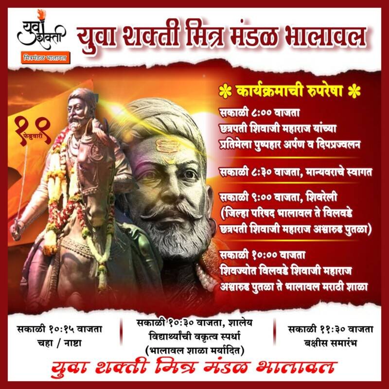 рдпрд╛рдирд┐рдорд┐рддреНрдд рд╕рдХрд╛рд│реА рео рд╡рд╛рдЬрддрд╛ рдЫрддреНрд░рдкрддреА рд╢рд┐рд╡рд╛рдЬреА рдорд╣рд╛рд░рд╛рдЬ рдпрд╛рдВрдЪреНрдпрд╛ рдкреНрд░рддрд┐рдореЗрд▓рд╛ рдкреБрд╖реНрдкрд╣рд╛рд░ рдЕрд░реНрдкрдг рд╡ рджреАрдкрдкреНрд░рдЬреНрд╡рд▓рди, рд╕рдХрд╛рд│реА рео:рейреж рд╡рд╛рдЬрддрд╛ рдорд╛рдиреНрдпрд╡рд░рд╛рдВрдЪреЗ рд╕реНрд╡рд╛рдЧрдд,рд╕рдХрд╛рд│реА реп рд╡рд╛рдЬрддрд╛ рднрд╛рд▓рд╛рд╡рд▓ рдкреНрд░рд╛рдердорд┐рдХ рд╢рд╛рд│рд╛ рддреЗ рд╡рд┐рд▓рд╡рдбреЗ рдЫрддреНрд░рдкрддреА рд╢рд┐рд╡рд╛рдЬреА рдорд╣рд╛рд░рд╛рдЬ рдЕрд╢реНрд╡рд╛рд░реВрдв рдкреБрддрд│реНрдпрд╛рдкрд░реНрдпрдВрдд рд╢рд┐рд╡рдЬреНрдпреЛрдд рд╡ рд╢рд┐рд╡рд░реЕрд▓реА,рд╕рдХрд╛рд│реА резреж:рейреж рд╡рд╛рдЬрддрд╛ рд╡рдХреНрддреГрддреНрд╡ рд╕реНрдкрд░реНрдзрд╛, рд╕рдХрд╛рд│реА резрез:рейреж рд╡рд╛рдЬрддрд╛ рдкрд╛рд░рд┐рддреЛрд╖рд┐рдХ рд╡рд┐рддрд░рдг рдЖрджреА рдХрд╛рд░реНрдпрдХреНрд░рдо рд╣реЛрдгрд╛рд░ рдЖрд╣реЗрдд.рдХрд╛рд░реНрдпрдХреНрд░рдорд╛рд▓рд╛ рдЙрдкрд╕реНрдерд┐рдд рд░рд╛рд╣рдгреНрдпрд╛рдЪреЗ рдЖрд╡рд╛рд╣рди рдпреБрд╡рд╛рд╢рдХреНрддреА рдордВрдбрд│рд╛рдЪреНрдпрд╛рд╡рддреАрдиреЗ рдХрд░рдгреНрдпрд╛рдд рдЖрд▓реЗ рдЖрд╣реЗ.