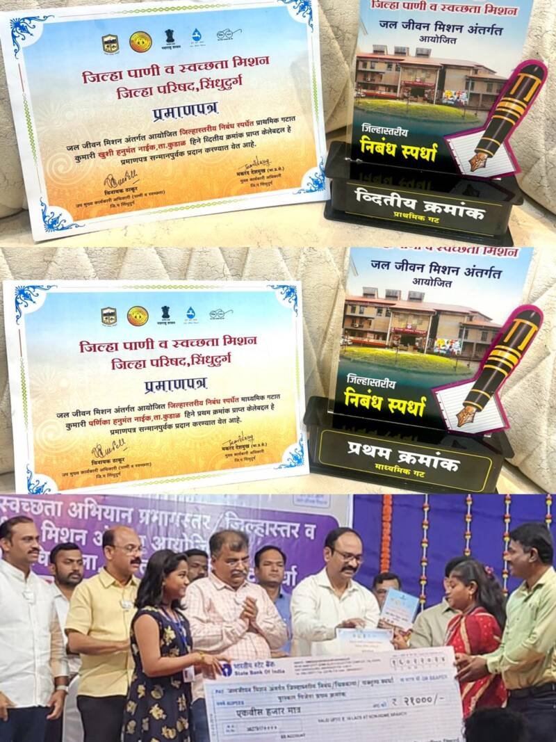 рд╕рдВрдд рдЧрд╛рдбрдЧреЗрдмрд╛рдмрд╛ рдЧреНрд░рд╛рдорд╕реНрд╡рдЪреНрдЫрддрд╛ рдЕрднрд┐рдпрд╛рди рдкреНрд░рднрд╛рдЧрд╕реНрддрд░, рдЬрд┐рд▓реНрд╣рд╛рд╕реНрддрд░ рд╡ рдЬрд▓ рдЬреАрд╡рди рдорд┐рд╢рди рдЖрдпреЛрдЬрд┐рдд рдЬрд┐рд▓реНрд╣рд╛рд╕реНрддрд░реАрдп рдирд┐рдмрдВрдз рд╕реНрдкрд░реНрдзреЗрдд рдХреБ.рдкрд░реНрдгрд┐рдХрд╛ рд╣рдиреБрдордВрдд рдирд╛рдИрдХ рдЗ. рдирд╡рд╡реА рдХреБрдбрд╛рд│ рд╣рд╛рдпрд╕реНрдХреВрд▓ рд╣рд┐рдиреЗ (рдЧрдЯ- рдЗ. 8 рд╡реА рддреЗ10 рд╡реА ) рдкреНрд░рдердо рдХреНрд░рдорд╛рдВрдХ рдкреНрд░рд╛рдкреНрдд рдХреЗрд▓реНрдпрд╛рдмрджреНрджрд▓ рдЬрд┐. рдк. рд╕рд┐рдВрдзреБрджреБрд░реНрдЧ рдЪреЗ рдореБрдЦреНрдпрдХрд╛рд░реНрдпрдХрд╛рд░реА рдорд╛. рд╢реНрд░реА. рдордХрд░рдВрдж рджреЗрд╢рдореБрдЦ рдпрд╛рдВрдЪреНрдпрд╛ рд╣рд╕реНрддреЗ рд╢рд╛рд▓-рд╢реНрд░реАрдлрд│ ,рдкреБрд╖реНрдкрдЧреБрдЪреНрдЫ, рд╕рдиреНрдорд╛рдирдЪрд┐рдиреНрд╣ рдЖрдгрд┐ рд░реЛрдЦ рд░рдХреНрдХрдо рд░реВ. 21000/-. ( рдПрдХрд╡рд┐рд╕ рд╣рдЬрд╛рд░) рджреЗрдКрди рд╕рдиреНрдорд╛рдирд┐рдд рдХрд░рдгреНрдпрд╛рдд рдЖрд▓реЗ. рддрд╕реЗрдЪ рд╣рдиреБрдордВрдд рдирд╛рдИрдХ рдпрд╛рдВрдЪреА рдЫреЛрдЯреА рдХрдиреНрдпрд╛ рдХреБ. рдЦреБрд╢реА рд╣рдиреБрдордВрдд рдирд╛рдИрдХ рдЗ. рдЪреМрдереА , рдЬрд┐. рдк. рдкрдбрддреЗрд╡рд╛рдбреА рд╢рд╛рд│рд╛, рдХреБрдбрд╛рд│ рд╣рд┐рдЪрд╛ рдкрдг рдпрд╛рдЪ рдирд┐рдмрдВрдз рд╕реНрдкрд░реНрдзреЗрдд ( рдЧрдЯ- рдЗ. 1 рд▓реА рддреЗ 7 рд╡реА ) рдЬрд┐рд▓реНрд╣рд╛ рд╕реНрддрд░рд╛рд╡рд░ рджреНрд╡рд┐рддреАрдп рдХреНрд░рдорд╛рдВрдХ рдкреНрд░рд╛рдкреНрдд рдХреЗрд▓реНрдпрд╛рдмрджреНрджрд▓ рдорд╣рд╛рд░рд╛рд╖реНрдЯреНрд░ рд░рд╛рдЬреНрдпрд╛рдЪреЗ рд╕рд╛рд░реНрд╡рдЬрдирд┐рдХ рдмрд╛рдВрдзрдХрд╛рдордордВрддреНрд░реА рддрдерд╛ рд╕рд┐рдВрдзреБрджреБрд░реНрдЧ рдЬрд┐рд▓реНрд╣реНрдпрд╛рдЪреЗ рдкрд╛рд▓рдХрдордВрддреНрд░реА рдорд╛рдирдирд┐рдп рд╢реНрд░реА- рд░рд╡рд┐рдВрджреНрд░ рдЪрд╡реНрд╣рд╛рдг рд╕рд╛рд╣реЗрдм рдпрд╛рдВрдЪреНрдпрд╛ рд╣рд╕реНрддреЗ рд╢рд╛рд▓-рд╢реНрд░реАрдлрд│, рдкреБрд╖реНрдкрдЧреБрдЪреНрдЫ, рд╕рдиреНрдорд╛рдирдЪрд┐рдиреНрд╣ рдЖрдгрд┐ рд░реЛрдЦ рд░рдХреНрдХрдо рд░реВ. 11000/- ( рдЕрдХрд░рд╛ рд╣рдЬрд╛рд░ ) рджреЗрдКрди рд╕рдиреНрдорд╛рдирд┐рдд рдХрд░рдгреНрдпрд╛рдд рдЖрд▓реЗ.