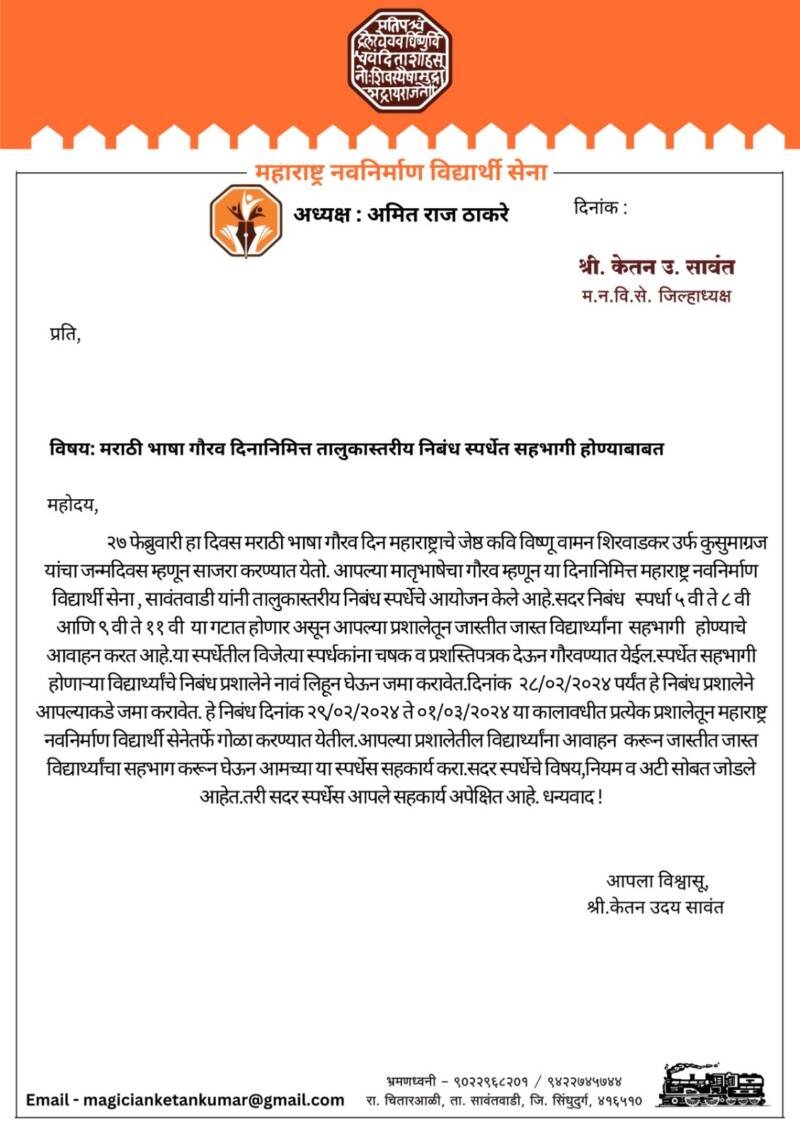 ЁЯО┤рд╕рд╛рд╡рдВрддрд╡рд╛рдбреА,рджрд┐.реирей:- рдорд╣рд╛рд░рд╛рд╖реНрдЯреНрд░ рдирд╡рдирд┐рд░реНрдорд╛рдг рд╡рд┐рджреНрдпрд╛рд░реНрдереА рд╕реЗрдирд╛ рдпрд╛рдВрдЪреНрдпрд╛ рд╡рддреАрдиреЗ рддрд╛рд▓реБрдХрд╛рд╕реНрддрд░реАрдп рдирд┐рдмрдВрдз рд╕реНрдкрд░реНрдзреЗрдЪреЗ рдЖрдпреЛрдЬрди рдХрд░рдгреНрдпрд╛рдд рдЖрд▓реЗ рдЖрд╣реЗ.реирен рдлреЗрдмреНрд░реБрд╡рд╛рд░реА рд╣рд╛ рджрд┐рд╡рд╕ рдорд░рд╛рдареА рднрд╛рд╖рд╛ рдЧреМрд░рд╡ рджрд┐рди рдорд╣рд╛рд░рд╛рд╖реНрдЯреНрд░рд╛рдЪреЗ рдЬреЗрд╖реНрда рдХрд╡рд┐ рд╡рд┐рд╖реНрдгреВ рд╡рд╛рдорди рд╢рд┐рд░рд╡рд╛рдбрдХрд░ рдЙрд░реНрдл рдХреБрд╕реБрдорд╛рдЧреНрд░рдЬ рдпрд╛рдВрдЪрд╛ рдЬрдиреНрдорджрд┐рд╡рд╕ рдореНрд╣рдгреВрди рд╕рд╛рдЬрд░рд╛ рдХрд░рдгреНрдпрд╛рдд рдпреЗрддреЛ. рдЖрдкрд▓реНрдпрд╛ рдорд╛рддреГрднрд╛рд╖реЗрдЪрд╛ рдЧреМрд░рд╡ рдореНрд╣рдгреВрди рдпрд╛ рджрд┐рдирд╛рдирд┐рдорд┐рддреНрдд рдорд╣рд╛рд░рд╛рд╖реНрдЯреНрд░ рдирд╡рдирд┐рд░реНрдорд╛рдг рд╡рд┐рджреНрдпрд╛рд░реНрдереА рд╕реЗрдирд╛, рд╕рд╛рд╡рдВрддрд╡рд╛рдбреА рдпрд╛рдВрдиреА рддрд╛рд▓реБрдХрд╛рд╕реНрддрд░реАрдп рдирд┐рдмрдВрдз рд╕реНрдкрд░реНрдзреЗрдЪреЗ рдЖрдпреЛрдЬрди рдХреЗрд▓реЗ рдЖрд╣реЗ. рд╕рджрд░ рдирд┐рдмрдВрдз рд╕реНрдкрд░реНрдзрд╛ рел рд╡реА рддреЗ рео рд╡реА рдЖрдгрд┐ реп рд╡реА рддреЗ резрез рд╡реА рдпрд╛ рдЧрдЯрд╛рдд рд╣реЛрдгрд╛рд░ рдЕрд╕реВрди рдЖрдкрд▓реНрдпрд╛ рдкреНрд░рд╢рд╛рд▓реЗрддреВрди рдЬрд╛рд╕реНрддреАрдд рдЬрд╛рд╕реНрдд рд╡рд┐рджреНрдпрд╛рд░реНрдереНрдпрд╛рдВрдирд╛ рд╕рд╣рднрд╛рдЧреА рд╣реЛрдгреНрдпрд╛рдЪреЗ рдЖрд╡рд╛рд╣рди рдордирд╕реЗ рдЪреНрдпрд╛ рд╡рддреАрдиреЗ рдХрд░рдгреНрдпрд╛рдд рдЖрд▓реЗ рдЖрд╣реЗ.рдпрд╛ рд╕реНрдкрд░реНрдзреЗрддреАрд▓ рд╡рд┐рдЬреЗрддреНрдпрд╛ рд╕реНрдкрд░реНрдзрдХрд╛рдВрдирд╛ рдЪрд╖рдХ рд╡ рдкреНрд░рд╢рд╕реНрддрд┐рдкрддреНрд░рдХ рджреЗрдКрди рдЧреМрд░рд╡рдгреНрдпрд╛рдд рдпреЗрдгрд╛рд░ рдЖрд╣реЗрдд. рд╕реНрдкрд░реНрдзреЗрдд рд╕рд╣рднрд╛рдЧреА рд╣реЛрдгрд╛рд▒реНрдпрд╛ рд╡рд┐рджреНрдпрд╛рд░реНрдереНрдпрд╛рдВрдЪреЗ рдирд┐рдмрдВрдз рдкреНрд░рд╢рд╛рд▓реЗрдиреЗ рдирд╛рд╡рдВ рд▓рд┐рд╣реВрди рдШреЗрдКрди рдЬрдорд╛ рдХрд░рд╛рд╡реЗрдд. рджрд┐рдирд╛рдВрдХ реирео/режреи/реирежреирек рдкрд░реНрдпрдВрдд рд╣реЗ рдирд┐рдмрдВрдз рдкреНрд░рд╢рд╛рд▓реЗрдиреЗ рдЖрдкрд▓реНрдпрд╛рдХрдбреЗ рдЬрдорд╛ рдХрд░рд╛рд╡реЗрдд. рд╣реЗ рдирд┐рдмрдВрдз рджрд┐рдирд╛рдВрдХ реиреп/режреи/реирежреирек рддреЗ режрез/режрей/реирежреирек рдпрд╛ рдХрд╛рд▓рд╛рд╡рдзреАрдд рдкреНрд░рддреНрдпреЗрдХ рдкреНрд░рд╢рд╛рд▓реЗрддреВрди рдорд╣рд╛рд░рд╛рд╖реНрдЯреНрд░ рдирд╡рдирд┐рд░реНрдорд╛рдг рд╡рд┐рджреНрдпрд╛рд░реНрдереА рд╕реЗрдиреЗрддрд░реНрдлреЗ рдЧреЛрд│рд╛ рдХрд░рдгреНрдпрд╛рдд рдпреЗрддреАрд▓. рдЖрдкрд▓реНрдпрд╛ рдкреНрд░рд╢рд╛рд▓реЗрддреАрд▓ рд╡рд┐рджреНрдпрд╛рд░реНрдереНрдпрд╛рдВрдирд╛ рдЖрд╡рд╛рд╣рди рдХрд░реВрди рдЬрд╛рд╕реНрддреАрдд рдЬрд╛рд╕реНрдд рд╡рд┐рджреНрдпрд╛рд░реНрдереНрдпрд╛рдВрдЪрд╛ рд╕рд╣рднрд╛рдЧ рдХрд░реВрди рдШреЗрдКрди рдЖрдордЪреНрдпрд╛ рдпрд╛ рд╕реНрдкрд░реНрдзреЗрд╕ рд╕рд╣рдХрд╛рд░реНрдп рдХрд░рд╛рд╡реЗ рдЕрд╕реЗ рдЖрд╡рд╛рд╣рди рдордирд