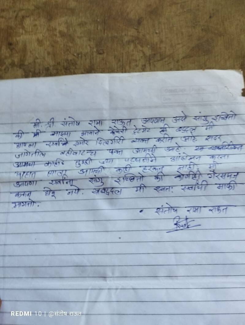 ЁЯО┤рдЖрдВрдмреЛрд▓реА, рджрд┐-режрей:- рдпреЗрдереАрд▓ рдЕрддрд┐рдХреНрд░рдордг рд╕рд░реНрд╡реНрд╣реЗ рдХреНрд░рдорд╛рдВрдХ 23 рдмрджреНрджрд▓ рджрд┐рд▓реЗрд▓реНрдпрд╛ рдЦреБрд▓рд╛рд╢рд╛рдмрджреНрджрд▓ рд╕рдВрддреЛрд╖ рд░рд╛рдКрдд рдЧрд╛рд╡рдардг рдпрд╛рдВрдиреА рджрд┐рд▓рдЧрд┐рд░реА рд╡реНрдпрдХреНрдд рдХреЗрд▓реА рдЕрд╕реВрди рдЧрд╛рд╡рдардг,рдлреМрдЬрджрд╛рд░ рд╡рд╛рдбреА,рд░рдорд╛рдИрдирдЧрд░ рдпреЗрдереАрд▓ рдЧреНрд░рд╛рдорд╕реНрдерд╛рдВрдЪреНрдпрд╛ рдЖрдВрджреЛрд▓рдирд╛рдмрджреНрджрд▓ рдЖрдкрд▓реНрдпрд╛рдХрдбреВрди рдЪреБрдХреАрдЪрд╛ рд╢рдмреНрдж рдЧреЗрд▓рд╛ рдЖрд╣реЗ,рддреЛ рдЖрдкрдг рдорд╛рдЧреЗ рдШреЗрдд рдЕрд╕реВрди рдЖрдкрд▓реА рдЖрдВрджреЛрд▓рдирд╛рдмрджреНрджрд▓ рдХреЛрдгрддреАрд╣реА рд╣рд░рдХрдд рдЕрдерд╡рд╛ рд╡рд┐рд░реЛрдзрд╛рддреНрдордХ рднреВрдорд┐рдХрд╛ рдирд╛рд╣реА.рдЧреНрд░рд╛рдорд╕реНрдерд╛рдВрдЪреНрдпрд╛ рдЖрдВрджреЛрд▓рдирд╛рдмрд╛рдмрдд рдЖрдкрд▓реА рд╡реЗрдЧрд│реА рднреВрдорд┐рдХрд╛ рдирд╛рд╣реА.рдХреЛрдгреАрд╣реА рдЪреБрдХреАрдЪрд╛ рд╕рдордЬ рдХрд░реВрди рдШреЗрдд рдЕрд╕рд▓реНрдпрд╛рд╕ рдЖрдкрдг рддреНрдпрд╛рдмрджреНрджрд▓ рджрд┐рд▓рдЧрд┐рд░реА рд╡реНрдпрдХреНрдд рдХрд░реАрдд рдЖрд╣реЛрдд рдЕрд╕реЗ рдкрддреНрд░рдХ рд╕рдВрддреЛрд╖ рд░рд╛рдорд╛ рд░рд╛рдКрдд рдпрд╛рдВрдиреА рджрд┐рд▓реЗ рдЖрд╣реЗ. рдмрд╛рд╣реЗрд░рдЪреНрдпрд╛ рд▓реЛрдХрд╛рдВрдЪреНрдпрд╛ рдЕрддрд┐рдХреНрд░рдордмрджреНрджрд▓ рдЖрдкрд▓рд╛ рдЧреНрд░рд╛рдорд╕реНрдерд╛рдВрдирд╛ рд╡рд┐рд░реЛрдз рдирд╛рд╣реА.рдЖрдкрд▓реА рддреНрдпрд╛ рдард┐рдХрд╛рдгреА рд╡рд╣рд┐рд╡рд╛рдЯ рдЖрд╣реЗ рдПрд╡рдврдВрдЪ рдЖрдкрд▓рдВ рдореНрд╣рдгрдгрдВ рдЖрд╣реЗ. рдЕрд╕рд╛ рдЦреБрд▓рд╛рд╕рд╛ рд╕рдВрддреЛрд╖ рд░рд╛рдКрдд рдпрд╛рдВрдиреА рдкрддреНрд░рдХрд╛рддреВрди рдХреЗрд▓рд╛ рдЖрд╣реЗ.