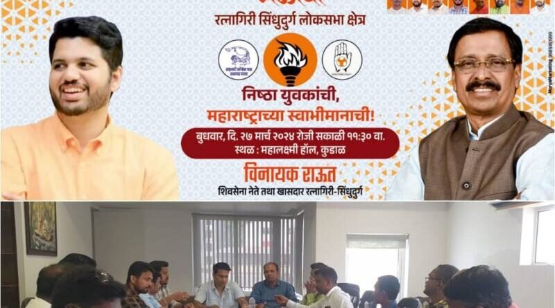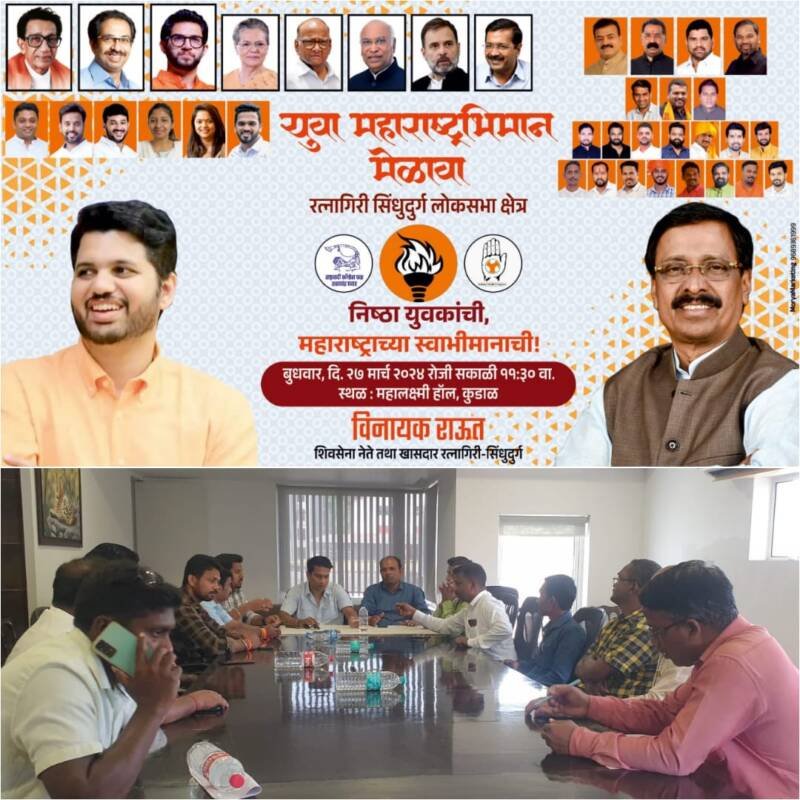 *🎴कणकवली, दि-२५*:-सिंधुदुर्ग रत्नागिरी लोकसभा क्षेत्रातील युवकांचा युवा महाराष्ट्रभिमान मेळावा बुधवार दि 27 मार्च 2024 रोजी सकाळी 11.30 वाजता महालक्ष्मी हॉल, कुडाळ येथे आयोजित करण्यात आला आहे. या मेळाव्याची कणकवली विधानसभेची तयारी पूर्ण झाली असून यात कणकवली-देवगड-वैभववाडी तालुक्यातून 400 ते 500 युवासैनिक या मेळाव्यासाठी उपस्थित राहणार आहेत. अशी माहिती युवासेना जिल्हाप्रमुख सुशांत नाईक यांनी आज झालेल्या बैठकीत दिली. आज कणकवली विधानसभेची नियोजन बैठक संपन्न झाली. येत्या काळात खासदार विनायक राऊत यांच्या विजयाचा निर्धार करण्यासाठी रत्नागिरी व सिंधुदुर्ग जिल्ह्यातील युवक कुडाळ येथील मेळाव्यास उपस्थित राहून खासदार विनायक राऊत यांच्या विजयाचा निश्चय करणार आहेत. या युवकांच्या माध्यमातून मेळाव्यातील संदेश व खासदार विनायक राऊत यांच्या विजयाचा निर्धार हा गावा – गावात पोहचणार आहे.