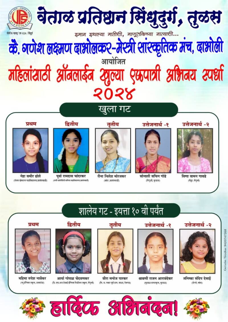 *🎴वेंगुर्ले, दि-०८*:-नाविन्यपूर्ण उपक्रम घेणाऱ्या वेताळ प्रतिष्ठान सिंधुदुर्ग तुळस आणि कै. गणेश लक्ष्मण दाभोलकर- मेस्त्री सांस्कृतिक मंच दाभोली यांच्या संयुक्त विद्यमाने *फक्त ‘महिलांसाठी’ कोणत्याही सामाजिक ज्वलंत विषयावर ऑनलाईन एकपात्री अभिनय स्पर्धेचे* आयोजन करण्यात आलेले होते.या स्पर्धेला दोन्ही गटातून महिलांचा उस्फूर्त प्रतिसाद लाभला.