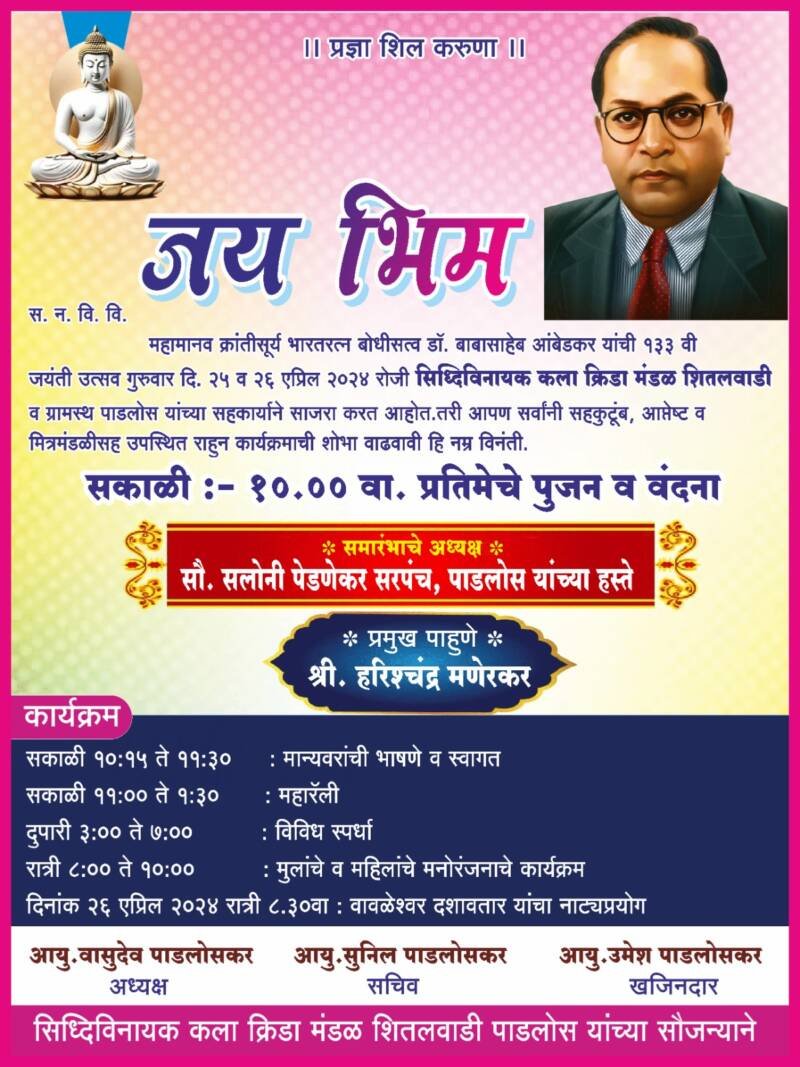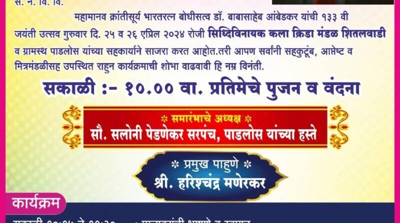 *🎴बांदा, दि-२३*:-भारतरत्न डॉ.बाबासाहेब आंबेडकर यांच्या जयंती उत्सवानिमित्त दि.25 व 26 एप्रिल रोजी पाडलोस सिद्धिविनायक कला क्रीडा मंडळ शितलवाडी व पाडलोस ग्रामस्थ यांच्या सहकार्याने दोन दिवस विविध कार्यक्रमांचे आयोजन करण्यात आले आहे. सकाळी 10 वा.प्रतिमेचे पूजन व वंदना होणार. समारंभाचे अध्यक्षपदी पाडलोस सरपंच सलोनी पेडणेकर,प्रमुख पाहुणे हरिश्चंद्र मणेरकर उपस्थित राहणार आहेत.त्यानंतर मान्यवरांचे मनोगत, महारॅली,विविध स्पर्धा, मुलांचे व महिलांचे मनोरंजनात्मक कार्यक्रम होणार आहेत.दि.26 एप्रिल रोजी रात्री 8.30 वा.वावळेश्वर दशावतार यांचा नाट्यप्रयोग सादर करण्यात येणार आहे. तरी सर्वांनी कार्यक्रमांचा लाभ घ्यावा असे आवाहन, सिद्धिविनायक कला क्रीडा मंडळ शितलवाडी पाडलोसचे अध्यक्ष वासुदेव पाडलोसकर, सचिव सुनील पाडलोसकर,खजिनदार उमेश पाडलोसकर यांनी केले आहे.