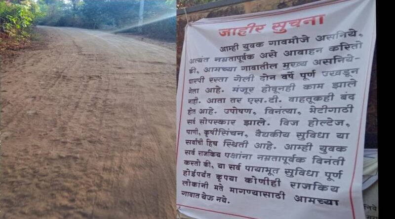 рдмреЕрдирд░ рдордзреНрдпреЗ рдЕрд╕реЗ рдореНрд╣рдгрдгреНрдпрд╛рдд рдЖрд▓реЗ рдЖрд╣реЗ рдХреА, рдЖрдореНрд╣реА рдпреБрд╡рдХ рдЧрд╛рд╡рдореМрдЬреЗ рдЕрд╕рдирд┐рдпреЗ, рдЕрддреНрдпрдВрдд рдирдореНрд░рддрд╛рдкреВрд░реНрд╡рдХ рдЕрд╕реЗ рдЖрд╡рд╛рд╣рди рдХрд░рд┐рддреЛ рдХреА, рдЖрдордЪреНрдпрд╛ рдЧрд╛рд╡рд╛рддреАрд▓ рдореБрдЦреНрдп рдЕрд╕рдирд┐рдпреЗ- рдШрд╛рд░рдкреА рд░рд╕реНрддрд╛ рдЧреЗрд▓реА рджреЛрди рд╡рд░реНрд╖реЗ рдкреВрд░реНрдг рдЙрдЦрдбреВрди рдЧреЗрд▓рд╛ рдЖрд╣реЗ. рдордВрдЬреВрд░ рд╣реЛрд╡реВрдирд╣реА рдХрд╛рдо рдЭрд╛рд▓реЗ рдирд╛рд╣реА. рдЖрддрд╛ рддрд░ рдПрд╕.рдЯреА. рд╡рд╛рд╣рддреВрдХрд╣реА рдмрдВрдж рд╣реЛрдд рдЖрд╣реЗ. рдЙрдкреЛрд╖рдг, рд╡рд┐рдирдВрддреНрдпрд╛, рднреЗрдЯреАрдЧрд╛рдареА рд╕рд░реНрд╡ рд╕реЛрдкрд╕реНрдХрд╛рд░ рдЭрд╛рд▓реЗ. рд╡рд┐рдЬ рд╣реЛрд▓реНрдЯреЗрдЬ, рдкрд╛рдгреА, рдХреГрд╖реАрд╕рд┐рдВрдЪрди, рд╡реИрджреНрдпрдХреАрдп рд╕реБрд╡рд┐рдзрд╛ рдпрд╛ рд╕рд░реНрд╡рд╛рдВрдЪреА рд╣рд┐рдЪ рд╕реНрдерд┐рддреА рдЖрд╣реЗ. рдЖрдореНрд╣реА рдпреБрд╡рдХ рд╕рд░реНрд╡ рд░рд╛рдЬрдХрд┐рдп рдкрдХреНрд╖рд╛рдВрдирд╛ рдирдореНрд░рддрд╛рдкреВрд░реНрд╡рдХ рд╡рд┐рдирдВрддреА рдХрд░рддреЛ рдХреА, рдпрд╛ рд╕рд░реНрд╡ рдкрд╛рдпрд╛рднреВрдд рд╕реБрд╡рд┐рдзрд╛ рдкреВрд░реНрдг рд╣реЛрдИрдкрд░реНрдпрдВрдд рдХреГрдкрдпрд╛ рдХреЛрдгреАрд╣реА рд░рд╛рдЬрдХрд┐рдп рд▓реЛрдХрд╛рдВрдиреА рдорддреЗ рдорд╛рдЧрдгреНрдпрд╛рд╕рд╛рдареА рдЖрдордЪреНрдпрд╛ рдЧрд╛рд╡рд╛рдд рдпреЗрдК рдирдпреЗ. рдЕрд╢рд╛ рдЖрд╢рдпрд╛рдЪреЗ рдмреЕрдирд░ рдЕрд╕рдирд┐рдпреЗ рдЧрд╛рд╡рд╛рдд рд▓рд╛рдЧрд▓реНрдпрд╛рдЪреЗ рджрд┐рд╕рдд рдЖрд╣реЗрдд.