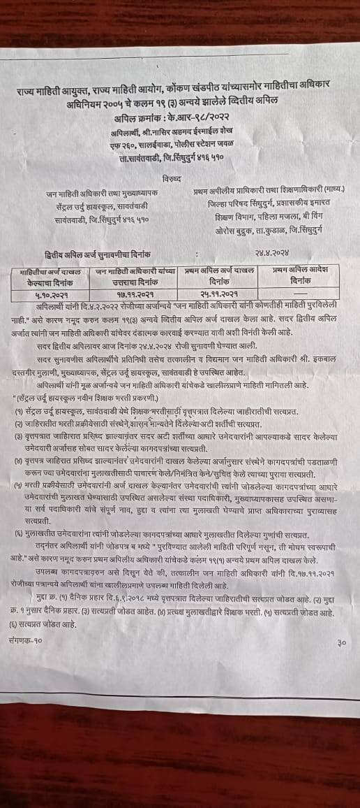 рдпрд╛рдмрд╛рдмрддрдЪреЗ рд╡реГрддреНрдд рдЕрд╕реЗ рдХреА рд╕рд╛рд╡рдВрддрд╡рд╛рдбреА рд╢рд╣рд░рд╛рддреАрд▓ рд╕рд╛рд╡рдВрддрд╡рд╛рдбреА рдорд░реНрдХрдЬреА рдЬрдорд╛рдд рдореБрдВрдмрдИ рд╕рдВрд╕реНрдереЗрдЪреЗ рдЙрдкрд╛рдзреНрдпрдХреНрд╖ рдирд╛рд╕рд┐рд░ рдЕрд╣рдордж рдЗрд╕реНрдорд╛рдИрд▓ рд╢реЗрдЦ рдпрд╛рдВрдиреА рдорд╛рд╣рд┐рддреАрдЪреНрдпрд╛ рдЕрдзрд┐рдХрд╛рд░рд╛рдд рд╕рд╛рд╡рдВрддрд╡рд╛рдбреА рдпреЗрдереАрд▓ рд╕реЗрдВрдЯреНрд░рд▓ рдЙрд░реНрджреВ рд╣рд╛рдпрд╕реНрдХреВрд▓ рдпрд╛рдВрдЪреНрдпрд╛рдХрдбреЗ рдирд╡реАрди рд╢рд┐рдХреНрд╖рдХ рднрд░рддреА рдкреНрд░рдХрд░рдгреА рдорд╛рд╣рд┐рддреА рдорд╛рдЧрд╡рд▓реА рд╣реЛрддреА рдпрд╛рдмрд╛рдмрддрдЪрд╛ рдорд╛рд╣рд┐рддреА рдЕрд░реНрдЬ 5 рдСрдХреНрдЯреЛрдмрд░ 2021 рд▓рд╛ рд╕рд╛рджрд░ рдХреЗрд▓рд╛ рд╣реЛрддрд╛ рдпрд╛рд╡рд░ рдкреНрд░рдердо рдЕрдкреАрд▓ 25 рдиреЛрд╡реНрд╣реЗрдВрдмрд░ 2021 рд▓рд╛ рдЭрд╛рд▓реЗ рджрд░рдореНрдпрд╛рди рдЕрдкрд┐рд▓рд╛рд░реНрдереА рд╢реЗрдЦ рдпрд╛рдВрдирд╛ рдкрд░рд┐рдкреВрд░реНрдг рдорд╛рд╣рд┐рддреА рджрд┐рд▓реА рдирд╛рд╣реА рддрд░ рджрд┐рд▓реЗрд▓реА рдорд╛рд╣рд┐рддреА рдореЛрдШрдо рд╕реНрд╡рд░реВрдкрд╛рдЪреА рдЕрд╕рд▓реНрдпрд╛рдЪреА рдмрд╛рдм рд░рд╛рдЬреНрдп рдорд╛рд╣рд┐рддреА рдЖрдпреБрдХреНрддрд╛рдВрдЪреНрдпрд╛ рдирд┐рджрд░реНрд╢рдирд╛рд╕ рдЖрдгреВрди рджрд┐рд▓реНрдпрд╛рдирдВрддрд░ рд╕реЗрдВрдЯреНрд░рд▓ рдЙрд░реНрджреВ рд╣рд╛рдпрд╕реНрдХреВрд▓рдЪреЗ рдореБрдЦреНрдпрд╛рдзреНрдпрд╛рдкрдХ рдЗрдХрдмрд╛рд▓ рджрд╕реНрддрдЧреАрд░ рдореБрд▓рд╛рдгреА рдпрд╛рдВрдирд╛ рд░рд╛рдЬреНрдп рдорд╛рд╣рд┐рддреА рдЖрдпреБрдХреНрддрд╛рдВрдиреА рдЕрдкрд┐рд▓ рдЕрдкрд┐рд▓рд╛рд░реНрдереА рдпрд╛рдВрдЪреНрдпрд╛ рдкрд╛рдЪ рдСрдХреНрдЯреЛрдмрд░ 2021 рдЪреНрдпрд╛ рдорд╛рд╣рд┐рддреА рдЕрд░реНрдЬрд╛рд▓рд╛ рдЕрдиреБрд╕рд░реВрди рд╡рд┐рд╣рд┐рдд рдореБрджрддреАрдд рдорд╛рд╣рд┐рддреА рдкреБрд░рд╡рд▓реНрдпрд╛рдЪрд╛ рдХреЛрдгрддрд╛рд╣реА рдкреБрд░рд╛рд╡рд╛ рдЖрдпреЛрдЧрд╛рдд рд╕рд╛рджрд░ рдХреЗрд▓рд╛ рдирд╛рд╣реА рдореНрд╣рдгреВрди рддреНрдпрд╛рдВрдЪреНрдпрд╛рд╡рд┐рд░реБрджреНрдз рдорд╛рд╣рд┐рддреАрдЪрд╛ рдЕрдзрд┐рдХрд╛рд░ рдЕрдзрд┐рдирд┐рдпрдо 2005 рдЕрдВрддрд░реНрдЧрдд реиреж(рез)┬а рдЕрдиреНрд╡рдпреЗ рдкреНрд░рддрд┐ рджрд┐рд╡рд╕ рд░реБрдкрдпреЗ 250 (рдЕрдзрд┐рдХрддрдо рд░реБрдкрдпреЗ 25000 рдкрд░реНрдпрдВрдд) рдЗрддрдХреНрдпрд╛ рд╢рд╛рд╕реНрддреАрдЪреА рдЖрдХрд╛рд░рдгреА рдХрд╛ рдХрд░рдгреНрдпрд╛рдд рдпреЗрдК рдирдпреЗ рдпрд╛рдЪрд╛ рд▓реЗрдЦреА рдЦреБрд▓рд╛рд╕рд╛ рдорд╛рдЧрд╡рд┐рд▓рд╛ рдЖрд╣реЗ рддрд╕реЗрдЪ рдпрд╛рдмрд╛рдмрддрдЪрд╛ рд▓реЗрдЦреА рдЦреБрд▓рд╛рд╕рд╛ 8 рдЬреВрди 2024 рд░реЛрдЬреА рдЪреНрдпрд╛ рд╕реБрдирд╛рд╡рдгреАрдЪреНрдпрд╛ рд╡реЗрд│реА рд╕реНрд╡рддрдГ рдЙрдкрд╕реНрдерд┐рдд рд░рд╛рд╣реВрди рдЖрдпреЛрдЧрд╛рдХрдбреЗ рд╕рд╛рджрд░ рдХрд░рд╛рд╡рд╛ рдЕрдиреНрдпрдерд╛ рд╢рд╛рд╕реНрддреНрд░реАрдЪреЗ рдЖрджреЗрд╢ рдХрд╛рдпрдо рдХреЗрд▓реЗ рдЬрд╛рддреАрд▓ рдЕрд╢реА рдиреЛрдЯреАрд╕ рдЬрд╛рд░реА рдХреЗрд▓реА рдЖрд╣реЗ рджрд░рдореНрдпрд╛рди рдкреБрдвреАрд▓ рд╕реБрдирд╛рд╡рдгреА рдЖрда рдЬреВрди 2024 рд░реЛрдЬреА рджреБрдкрд╛рд░реА рдмрд╛рд░рд╛ рд╡рд╛рдЬ