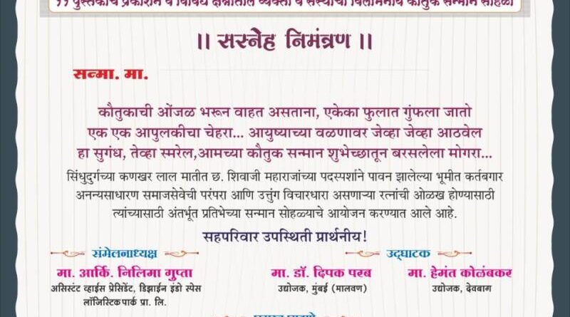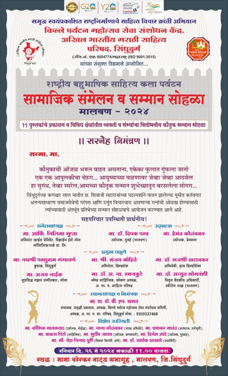ЁЯО┤рдорд╛рд▓рд╡рдг, рджрд┐-реиреи:– рд╕рд┐рдВрдзреБрджреБрд░реНрдЧрдЪреНрдпрд╛ рдХрдгрдЦрд░ рд▓рд╛рд▓ рдорд╛рддреАрдд рдЫрддреНрд░рдкрддреА рд╢рд┐рд╡рд╛рдЬреА рдорд╣рд╛рд░рд╛рдЬрд╛рдВрдЪреНрдпрд╛ рдкрджрд╕реНрдкрд░реНрд╢рд╛рдиреЗ рдкрд╛рд╡рди рдЭрд╛рд▓реЗрд▓реНрдпрд╛ рднреВрдореАрдд рдХрд░реНрддрдмрджрд╛рд░ рдЕрдирдиреНрдпрд╕рд╛рдзрд╛рд░рдг рд╕рдорд╛рдЬрд╕реЗрд╡реЗрдЪреА рдкрд░рдВрдкрд░рд╛ рдЖрдгрд┐ рдЙрддреНрддреБрдВрдЧ рд╡рд┐рдЪрд╛рд░рдзрд╛рд░рд╛ рдЕрд╕рдгрд╛рд▒реНрдпрд╛ рд░рддреНрдирд╛рдВрдЪреА рдУрд│рдЦ рд╣реЛрдгреНрдпрд╛рд╕рд╛рдареА рддрд╕реЗрдЪ рддреНрдпрд╛рдВрдЪреНрдпрд╛ рдЕрдВрддрд░реНрднреВрдд рдкреНрд░рддрд┐рднреЗрд▓рд╛ рд╡рд╛рд╡ рдорд┐рд│рдгреНрдпрд╛рд╕рд╛рдареА рдХрд┐рд▓реНрд▓реЗ рдкрд░реНрдпрдЯрди рдорд╣реЛрддреНрд╕рд╡ рд╕реЗрд╡рд╛ рд╕рдВрд╢реЛрдзрди рдХреЗрдВрджреНрд░ рдЖрдгрд┐ рдЕрдЦрд┐рд▓ рднрд╛рд░рддреАрдп рдорд░рд╛рдареА рд╕рд╛рд╣рд┐рддреНрдп рдкрд░рд┐рд╖рдж рд╕рд┐рдВрдзреБрджреБрд░реНрдЧ рдпрд╛рдВрдЪреНрдпрд╛рд╕рдВрдпреБрдХреНрдд рд░рд╛рд╖реНрдЯреНрд░реАрдп рдмрд╣реБрднрд╛рд╖рд┐рдХ рд╕рд╛рд╣рд┐рддреНрдп,рдХрд▓рд╛, рдкрд░реНрдпрдЯрди, рд╕рд╛рдорд╛рдЬрд┐рдХ рд╕рдВрдореЗрд▓рди рд╡ рд╕рдиреНрдорд╛рди рд╕реЛрд╣рд│реНрдпрд╛рдЪреЗ рдЖрдпреЛрдЬрди рдорд╛рдорд╛ рд╡рд░реЗрд░рдХрд░ рдирд╛рдЯреНрдпрдЧреГрд╣, рдорд╛рд▓рд╡рдг рдпреЗрдереЗ реирем рдореЗ рд░реЛрдЬреА рд╕рдХрд╛рд│реА резрез рд╡рд╛рдЬрддрд╛ рдХрд░рдгреНрдпрд╛рдд рдЖрд▓реЗ рдЖрд╣реЗ. рдпрд╛ рд╕рдВрдореЗрд▓рдирд╛рдЪреЗ рд╕рдВрдореЗрд▓рдирд╛рдзреНрдпрдХреНрд╖ рдореНрд╣рдгреВрди рдЕрд╕рд┐рд╕реНрдЯрдВрдЯ рд╡реНрд╣рд╛рдИрд╕ рдкреНрд░реЗрд╕рд┐рдбреЗрдВрдЯ рдбрд┐рдЭрд╛рдИрди рдЗрдВрдбреЛ рд╕реНрдкреЗрд╕ рд▓реЙрдЬрд┐рд╕реНрдЯрд┐рдХ рдкрд╛рд░реНрдХ рдкреНрд░рд╛рдпрд╡реНрд╣реЗрдЯ рд▓рд┐рдорд┐рдЯреЗрдб рдЪреЗ рдЖрд░реНрдХрд┐рдЯреЗрдХреНрдЪрд░ рдиреАрд▓рд┐рдорд╛ рдЧреБрдкреНрддрд╛ рд╣реЗ рднреВрд╖рд╡рдгрд╛рд░ рдЖрд╣реЗрдд. рдпрд╛ рдХрд╛рд░реНрдпрдХреНрд░рдорд╛рдЪреЗ рдЙрджреНрдШрд╛рдЯрди рд╕реБрдкреНрд░рд╕рд┐рджреНрдз рдЙрджреНрдпреЛрдЬрдХ, рд╢рд┐рдХреНрд╖рдгрдорд╣рд░реНрд╖реА, рд╕рдорд╛рдЬрд╕реЗрд╡рдХ рдбреЙ. рджреАрдкрдХ рдкрд░рдм рддрд╕реЗрдЪ рдорд╛рдирд╕реЛрдкрдЪрд╛рд░ рддрдЬреНрдЮ рд╡ рдЙрджреНрдпреЛрдЬрдХ рд╣реЗрдордВрдд рдХреЛрд│рдВрдмрдХрд░ рдпрд╛рдВрдЪреНрдпрд╛ рд╣рд╕реНрддреЗ рд╣реЛрдгрд╛рд░ рдЖрд╣реЗ. рдпрд╛ рдХрд╛рд░реНрдпрдХреНрд░рдорд╛рд▓рд╛ рдкреНрд░рдореБрдЦ рдкрд╛рд╣реБрдгреЗ рдореНрд╣рдгреВрди рд╕рд┐рдВрдзреБрджреБрд░реНрдЧрд╛рдЪреЗ рд╕реБрдкреБрддреНрд░ рдкрджреНрдорд╢реНрд░реА рдкрд░рд╢реБрд░рд╛рдо рдЧрдВрдЧрд╛рд╡рдгреЗ, рдЕрднрд┐рдиреЗрддреЗ рд╡ рджрд┐рдЧреНрджрд░реНрд╢рдХ рд╢реНрд░реА. рд╕рдВрдЬрдп рдореЛрд╣рд┐рддреЗ, рдЕрднрд┐рдиреЗрддреНрд░реА рдиреГрддреНрдпрджрд┐рдЧреНрджрд░реНрд╢рд┐рдХрд╛ рдбреЙ. рд░рд╛рдЬрд╢реНрд░реА рдЦрдЯрд╛рд╡рдХрд░, рдЧреЛрд╡реНрдпрд╛рдЪреЗ рд╕реБрдкреНрд░рд╕рд┐рджреНрдз рдЧрдЭрд▓ рд╕рдВрдЧреАрддрдХрд╛рд░ рдЕрдЬрдп рдирд╛рдИрдХ, рдЬреНрдпреЗрд╖реНрда рд╕рд╛рд╣рд┐рддреНрдпрд┐рдХ рдбреЙ. рдЕ.рдирд╛. рд░рд╕рдирдХреБрдЯреЗ, рдорд╛рд▓рд╡рдг рдпреЗрдереАрд▓ рдирд┐рд╡р