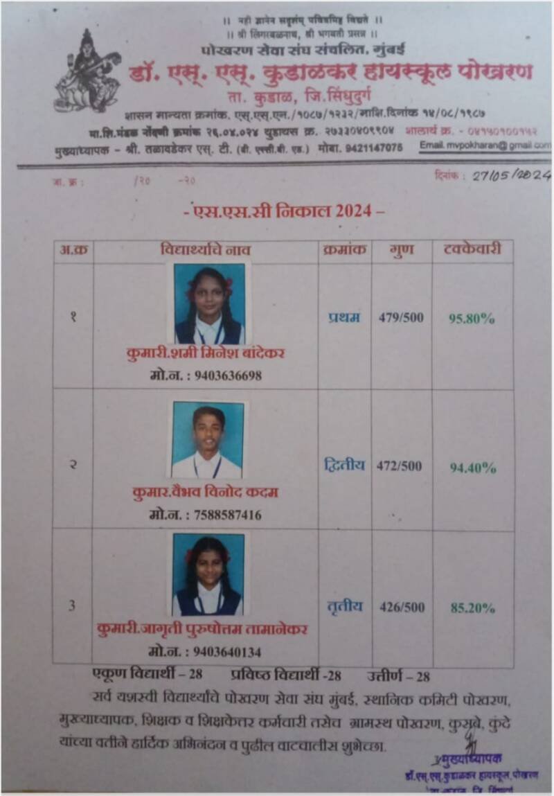 *🎴सिंधुदुर्ग, दि-२७*:-डॉ एस एस कुडाळकर हायस्कूल पोखरण हायस्कूलचा निकाल शंभर टक्के लागला असून शमी मिनेश बांदेकर प्रथम क्रमांक 95.80 टक्के वैभव विनोद कदम द्वितीय क्रमांक 94.40 टक्के जागृती पुरुषोत्तम तामानेकर तृतीय क्रमांक 95.20 टक्के सर्व यशस्वी विद्यार्थ्यांचे संस्था अध्यक्ष सचिव मुख्याध्यापक शिक्षक शिक्षकेतर कर्मचारी यांनी अभिनंदन केले आहे.