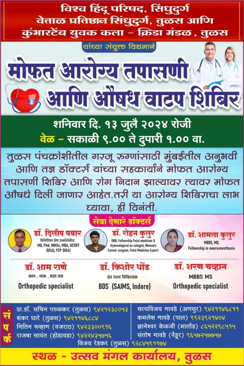 ЁЯО┤рд╡реЗрдВрдЧреБрд░реНрд▓реЗ, рджрд┐-резреж:– рд╡рд┐рд╢реНрд╡ рд╣рд┐рдВрджреВ рдкрд░рд┐рд╖рдж рд╕рд┐рдВрдзреБрджреБрд░реНрдЧ рдЖрдгрд┐ рд╡реЗрддрд╛рд│ рдкреНрд░рддрд┐рд╖реНрдард╛рди рд╕рд┐рдВрдзреБрджреБрд░реНрдЧ рддреБрд│рд╕, рдХреБрдВрднрд╛рд░ рдЯреЗрдВрдм рдпреБрд╡рдХ рдХрд▓рд╛ рдХреНрд░реАрдбрд╛ рдордВрдбрд│ рддреБрд│рд╕ рдпрд╛рдВрдЪреНрдпрд╛ рд╕рдВрдпреБрдХреНрдд рд╡рд┐рджреНрдпрдорд╛рдиреЗ рддреБрд│рд╕ рдпреЗрдереЗ рд╢рдирд┐рд╡рд╛рд░ рджрд┐рдирд╛рдВрдХ резрей рдЬреБрд▓реИ реирежреирек рд░реЛрдЬреА рд╕рдХрд╛рд│реА реп.режреж рддреЗ рджреБрдкрд╛рд░реА рез.режреж рдкрд░реНрдпрдВрдд рддреБрд│рд╕ рдпреЗрдереАрд▓ рдЙрддреНрд╕рд╡ рдордВрдЧрд▓ рдХрд╛рд░реНрдпрд╛рд▓рдп рдпреЗрдереЗ рдореЛрдлрдд рдЖрд░реЛрдЧреНрдп рддрдкрд╛рд╕рдгреА рдЖрдгрд┐ рдФрд╖рдз рд╡рд╛рдЯрдк рд╢рд┐рдмрд┐рд░рд╛рдЪреЗ рдЖрдпреЛрдЬрди рдХрд░рдгреНрдпрд╛рдд рдЖрд▓реЗ рдЖрд╣реЗ.