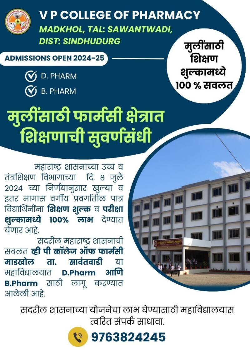 सदरील महाराष्ट्र शासनाची सवलत व्ही पी कॉलेज ऑफ फार्मसी, माडखोल ता. सावंतवाडी या महाविद्यालयात डी.फार्म व बी. फार्म या अभ्यासक्रमासाठी लागू करण्यात आलेली आहे. या शासनाच्या निर्णयाने विद्यार्थिनींना तसेच पालकांमध्ये आनंदाचे वातावरण पसरले आहे सदरील शासनाच्या योजनेचा लाभ घेण्यासाठी महाविद्यालयास संपर्क साधावा असे आवाहन करण्यात आले आहे.