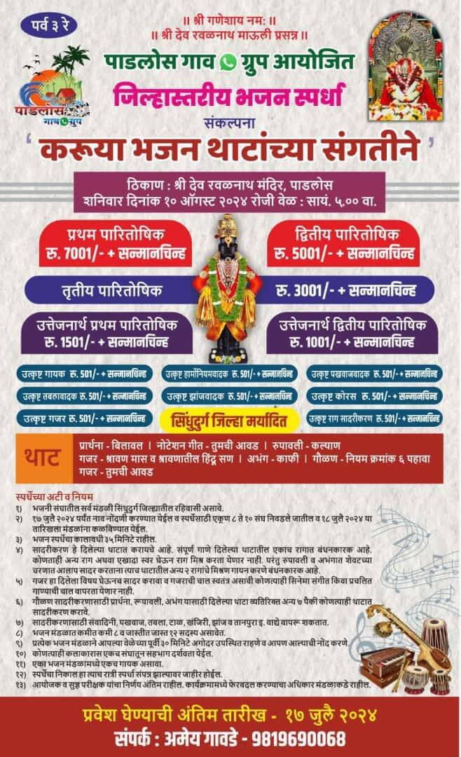 पाडलोस गाव व्हॉटस्अॅप ग्रुप आयोजित जिल्हास्तरीय भजन स्पर्धेचे आयोजन करण्यात आले आहे. शनिवार दि.10 ऑगस्ट रोजी संध्या.5 वा.श्री देव रवळनाथ मंदिरात स्पर्धा पार पडणार. भजन स्पर्धेचे तिसरे पर्व असून यावर्षी ‘करूया भजन थाटांच्या संगतीने’ संकल्पनेवर आधारीत आहे.