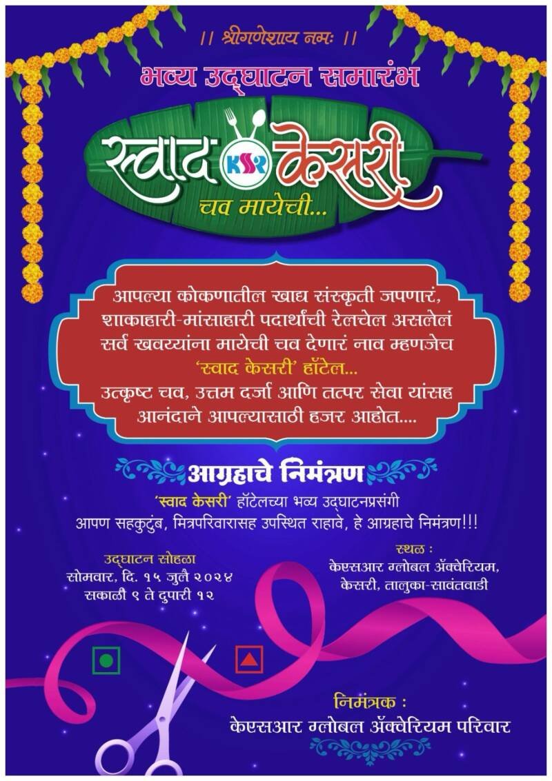सावंतवाडी तालुक्यातील केसरी येथे केएसआर ग्लोबल अँक्वेरियम येथे सुरु करण्यात येणारे स्वाद केसरी हॉटेलचे उद्घाटन सोमवार , १५ जुलै रोजी सकाळी ९ वाजता होणार आहे. उत्कृष्ट चव, उत्तम दर्जा व शाकाहारी-मांसाहारी पदार्थांचे नवीन ठिकाण आता खवय्यांसाठी तसेच कोकणातील पर्यटकांसाठी उपलब्ध होणार आहे. या भव्य उदघाटनप्रसंगी सकाळी ९ ते दुपारी १२ या वेळेत उपस्थित राहण्याचे आवाहन निमंत्रक केएसआर ग्लोबल अँक्वेरियम परिवाराच्यावतीने करण्यात आले आहे.