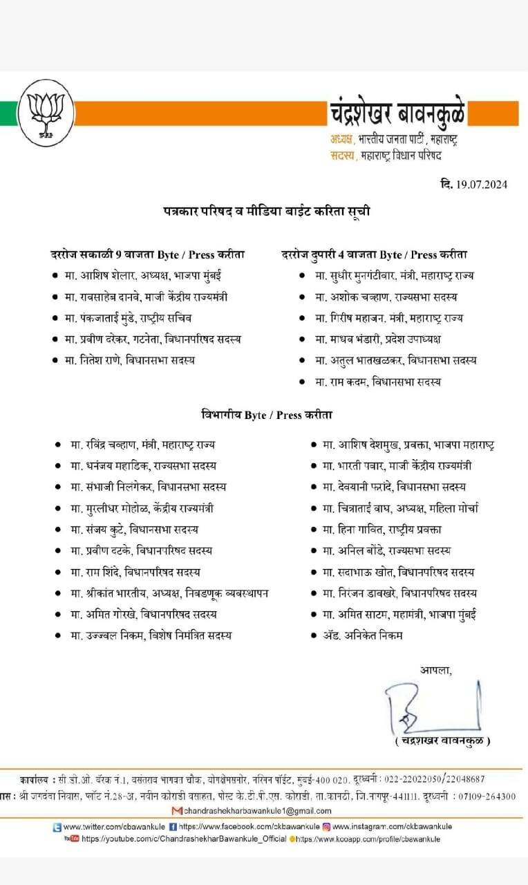 *🎴कणकवली, दि-२०:-* भाजपा प्रदेशाध्यक्ष चंद्रशेखर बावनकुळे यांच्याकडून महाराष्ट्र भाजपाची भूमिका मांडण्याकरिता व प्रसारमाध्यमांकडे प्रतिक्रिया देण्याकरता पत्रकार परिषद घेणे व मीडिया बाइट देण्याकरता अधिकृत प्रवक्त्यांची यादी जाहीर करण्यात आली आहे. यामध्ये विभागणी करण्यात आली असून सकाळी ९ वाजता पक्षाची भूमिका मांडण्याकरता जाहीर करण्यात आलेल्या प्रमुख नेत्यांच्या यादीमध्ये कणकवली मतदारसंघाचे आमदार नितेश राणे यांना स्थान देण्यात आले आहे. मुंबई भाजपाचे अध्यक्ष आशिष शेलार यांच्यासह अन्य भाजप नेत्यांचा देखील या यादीमध्ये समावेश आहे. दुपारी ४ वाजता घेण्यात येणाऱ्या पत्रकार परिषद व बाईट करता भाजप प्रदेश उपाध्यक्ष माधव भंडारी यांच्यासह भाजपाच्या अन्य नेत्यांचा समावेश करण्यात आला आहे. तर विभागीय बाईट व पत्रकार परिषदे करता राज्याचे सार्वजनिक बांधकाम मंत्री रवींद्र चव्हाण यांच्यासह भाजपाच्या अन्य नेत्यांचा समावेश या प्रवक्त्यांच्या यादीमध्ये करण्यात आला आहे. आमदार नितेश राणे यांनी यापूर्वी अनेकदा पक्षाची भूमिका ठोस व यशस्वीपणे मांडल्याने त्यांचा पुन्हा या भाजपाच्या यादीमध्ये समावेश करण्यात आला आहे. प्रदेशाध्यक्ष चंद्रशेखर बावनकुळे यांनी ही यादी जाहीर केली आहे.