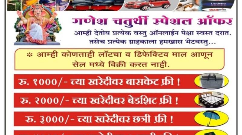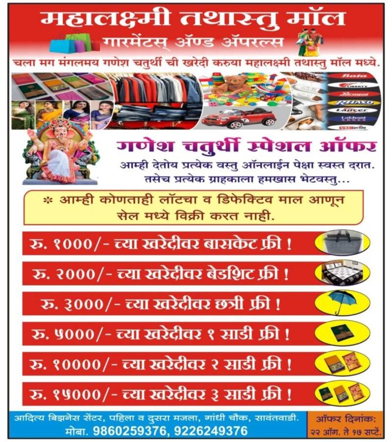 🔖चला मग या… वाट कसली पाहताय 🏃♀️आजच महालक्ष्मी तथास्तु मॉल भेट द्या आणि गणेश चतुर्थीनिमित्त खरेदी 🛍करा व आपला *आनंद व्दिगुणीत* करा…!!😇