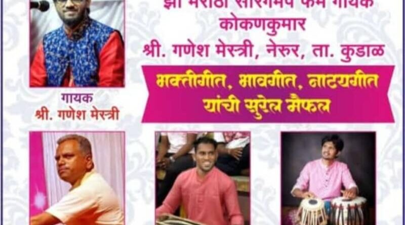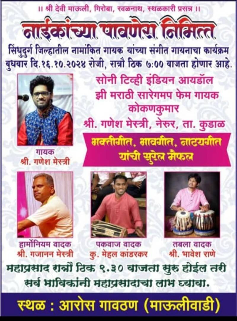 ЁЯО┤рд╕рд╛рд╡рдВрддрд╡рд╛рдбреА , рджрд┐ -резрем:- рд╕реЛрдиреА рдЯреАрд╡реНрд╣реА ,рдЗрдВрдбрд┐рдпрди рдЖрдпрдбреЙрд▓, рдЭреА рдорд░рд╛рдареА ,рд╕рд╛рд░реЗрдЧрдордк ,рдХреЛрдХрдгрдХреБрдорд╛рд░ рд╕рд┐рдВрдзреБрджреБрд░реНрдЧрд╛рддреАрд▓ рдирд╛рдорд╛рдВрдХрд┐рдд рдЧрд╛рдпрдХ рд╢реНрд░реА.рдЧрдгреЗрд╢ рдореЗрд╕реНрддреНрд░реА рдпрд╛рдВрдЪрд╛ рдмреБрдзрд╡рд╛рд░ рджрд┐рдирд╛рдВрдХ резрем рдСрдХреНрдЯреЛрдВрдмрд░ реирежреирек рд░реЛрдЬреА рд░рд╛рддреНрд░реМ рен:режреж рд╡рд╛рдЬрддрд╛ рдЖрд░реЛрд╕ рдЧрд╛рд╡рдардг (рдорд╛рдКрд▓реА рд╡рд╛рдбреА) рдпреЗрдереЗ рднрдХреНрддреАрдЧреАрдд,рднрд╛рд╡рдЧреАрдд,рдирд╛рдЯреНрдпрдЧреАрдд рдЧрд╛рдпрдирд╛рдЪрд╛ рдХрд╛рд░реНрдпрдХреНрд░рдо рд╣реЛрдгрд╛рд░ рдЖрд╣реЗ .рдпрд╛ рдХрд╛рд░реНрдпрдХреНрд░рдорд╛рдд рд╣рд╛рд░реНрдореЛрдирд┐рдпрдо рд╡рд╛рджрдХ рд╢реНрд░реА рдЧрдЬрд╛рдирди рдореЗрд╕реНрддреНрд░реА, рдкрдЦрд╡рд╛рдЬ рд╡рд╛рджрдХ рдореЗрд╣рд▓ рдХрд╛рдВрдбрд░рдХрд░, рддрдмрд▓рд╛ – рднрд╛рд╡реЗрд╢ рд░рд╛рдгреЗ рдпрд╛рдВрдЪреА рд╕рд╛рде рдЕрд╕рдгрд╛рд░ рдЖрд╣реЗ.