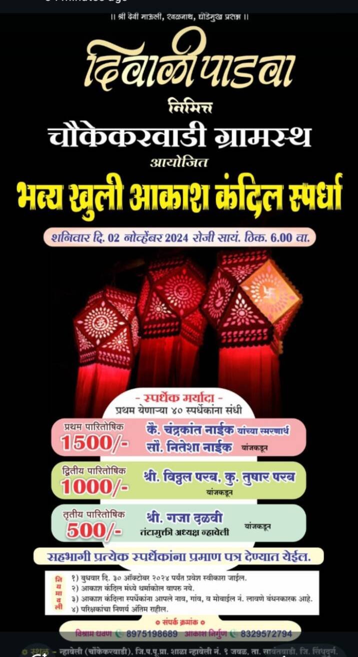 *🎴सावंतवाडी, दि-२६:-* दिवाळी पाडव्यानिमित्त न्हावेली चौकेकरवाडी ग्रामस्थ आयोजित शनिवार दि. ०२ नोव्हेंबर २०२४ रोजी सायंकाळी ठिक ६ वाजता भव्य खुली आकाश कंदील स्पर्धा आयोजित करण्यात आली आहे. या स्पर्धेसाठी प्रथम येणाऱ्या ४० स्पर्धेकांना संधी देण्यात येणार आहे. या स्पर्धेसाठी रोख पारितोषिके तसेचं स्पर्धेत सहभागी प्रत्येक स्पर्धकाला प्रमाणपत्र देण्यात येणार आहे. स्पर्धेचे प्रथम पारितोषिक रोख रुपये १५००/- कै. चंद्रकांत नाईक यांच्या स्मरणार्थ सौ. नितेशा नाईक यांजकडून, द्वितीय पारितोषिक रोख रुपये १०००/- श्री. विठ्ठल परब, कु. तुषार परब यांजकडून तर तृतीय पारितोषिक रोख रुपये ५००/- श्री. गजा दळवी तंटामुक्ती अध्यक्ष न्हावेली यांजकडून ठेवण्यात आले आहे.