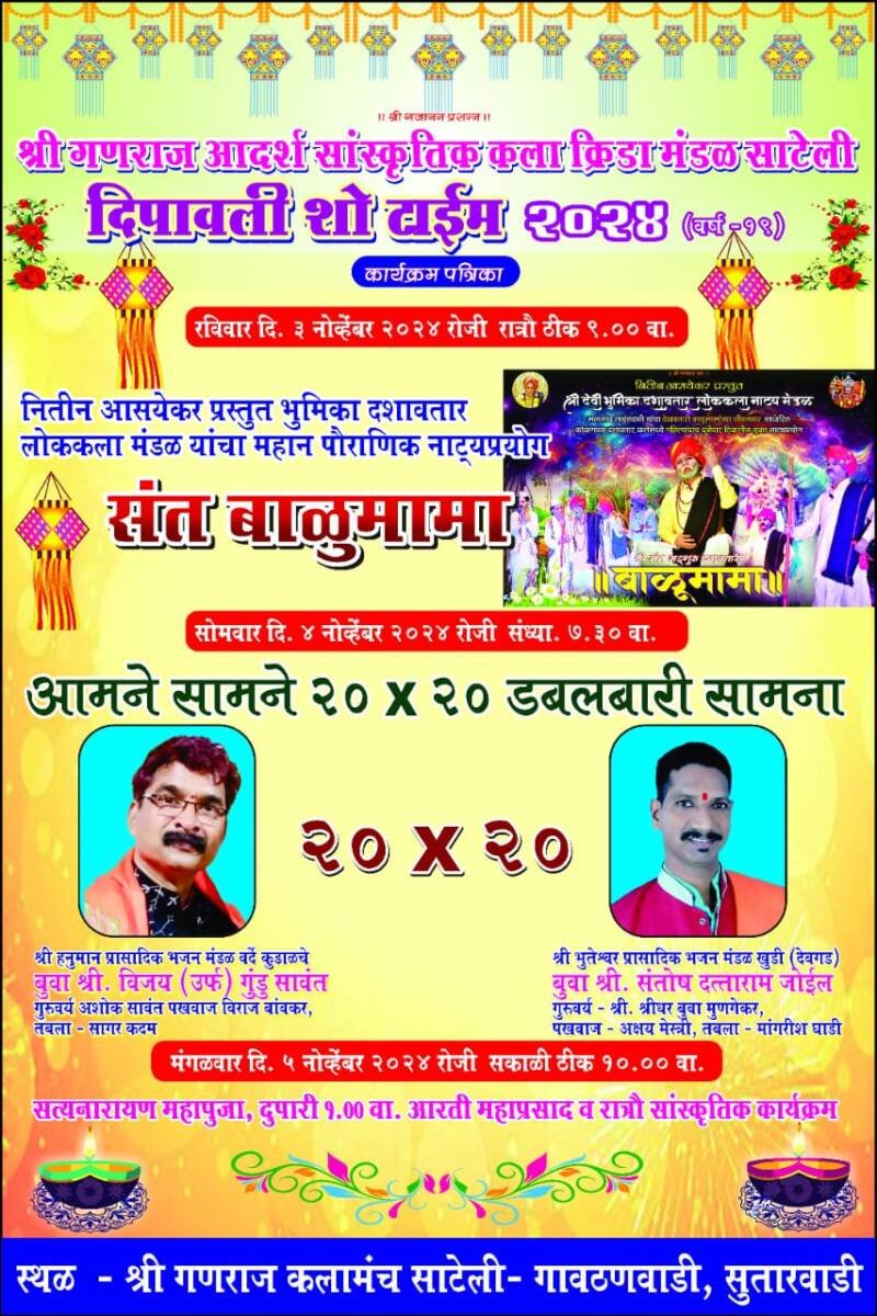 рдпрд╛ рдХрд╛рд░реНрдпрдХреНрд░рдорд╛рдВрдЪреА рд╕реБрд░реБрд╡рд╛рдд рд░рд╡рд┐рд╡рд╛рд░ рджрд┐рдирд╛рдВрдХ режрей рдиреЛрд╡реНрд╣реЗрдВрдмрд░ реирежреирек рд░рд╛рддреНрд░реА режреп :режреж рд╡рд╛рдЬрддрд╛ рдирд┐рддреАрди рдЖрд╕рдпреЗрдХрд░ рдкреНрд░рд╕реНрддреБрдд рднреВрдорд┐рдХрд╛ рджрд╢рд╛рд╡рддрд╛рд░ рд▓реЛрдХрдХрд▓рд╛ рдордВрдбрд│ рдпрд╛рдВрдЪрд╛ рдорд╣рд╛рди рдкреМрд░рд╛рдгрд┐рдХ ” рд╕рдВрдд рдмрд╛рд│реВрдорд╛рдорд╛ ” рдпрд╛ рдирд╛рдЯреНрдп рдкреНрд░рдпреЛрдЧрд╛рдиреЗ рд╣реЛрдгрд╛рд░ рдЖрд╣реЗ. рддреНрдпрд╛ рдирдВрддрд░ рд╕реЛрдорд╡рд╛рд░ рджрд┐рдирд╛рдВрдХ режрек рдиреЛрд╡реНрд╣реЗрдВрдмрд░ реирежреирек рд╕рдВрдзреНрдпрд╛рдХрд╛рд│реА режрен:рейреж рд╡рд╛рдЬрддрд╛ рдЖрдордиреЗ – рд╕рд╛рдордиреЗ реиреж ├Ч реиреж рдбрдмрд▓рдмрд░реАрдЪрд╛ рдЬрдВрдЧреА рд╕рд╛рдордирд╛ рд╢реНрд░реА рд╣рдиреБрдорд╛рди рдкреНрд░рд╛рд╕рд╛рджрд┐рдХ рднрдЬрди рдордВрдбрд│ рд╡рд░реНрджреЗ рдХреБрдбрд╛рд│рдЪреЗ рдмреБрд╡рд╛ рд╢реНрд░реА . рд╡рд┐рдЬрдп рдЙрд░реНрдл рдЧреБрдВрдбреВ рд╕рд╛рд╡рдВрдд рдЧреБрд░реБрд╡рд░реНрдп – рдЕрд╢реЛрдХ рд╕рд╛рд╡рдВрдд, рдкрдЦрд╡рд╛рдЬ – рд╡рд┐рд░рд╛рдЬ рдмрд╛рдВрд╡рдХрд░,рддрдмрд▓рд╛ – рд╕рд╛рдЧрд░ рдХрджрдо рд╡рд┐рд░реВрджреНрдз рд╢реНрд░реА рднреВрддреЗрд╢реНрд╡рд░ рдкреНрд░рд╛рд╕рд╛рджрд┐рдХ рднрдЬрди рдордВрдбрд│ рдЦреБрдбреА( рджреЗрд╡рдЧрдб) рдмреБрд╡рд╛ рд╢реНрд░реА . рд╕рдВрддреЛрд╖ рджрддреНрддрд╛рд░рд╛рдо рдЬреЛрдИрд▓ рдЧреБрд░реБрд╡рд░реНрдп – рд╢реНрд░реА рд╢реНрд░реАрдзрд░ рдмреБрд╡рд╛ рдореБрдгрдЧреЗрдХрд░ , рдкрдЦрд╡рд╛рдЬ – рдЕрдХреНрд╖рдп рдореЗрд╕реНрддреНрд░реА , рддрдмрд▓рд╛ – рдорд╛рдВрдЧрд░реАрд╢ рдШрд╛рдбреА рдпрд╛рдВрдЪрд╛ рдбрдмрд▓рдмрд╛рд░реА рднрдЬрдирд╛рдЪрд╛ рд╕рд╛рдордирд╛ рд╣реЛрдгрд╛рд░ рдЖрд╣реЗ. рддреНрдпрд╛рдирдВрддрд░ рдмреБрдзрд╡рд╛рд░ рджрд┐рдирд╛рдВрдХ режрел рдиреЛрд╡реНрд╣реЗрдВрдмрд░ рд░реЛрдЬреА рд╕рдХрд╛рд│реА резреж рд╡рд╛рдЬрддрд╛ рд╕рддреНрдпрдирд╛рд░рд╛рдпрдг рдорд╣рд╛рдкреБрдЬрд╛ , рджреБрдкрд╛рд░реА рез рд╡рд╛рдЬрддрд╛ рдЖрд░рддреА рд╡ рдорд╣рд╛рдкреНрд░рд╕рд╛рдж рд╡ рд░рд╛рддреНрд░реА рд╕рд╛рдВрд╕реНрдХреГрддрд┐рдХ рдХрд╛рд░реНрдпрдХреНрд░рдо рдЕрд╢рд╛ рдкреНрд░рдХрд╛рд░реЗ рдЖрдпреЛрдЬрди рдХрд░рдгреНрдпрд╛рдд рдЖрд▓реЗ рдЖрд╣реЗ. рддрд░реА рд░рд╕реАрдХ рдкреНрд░реЗрдХреНрд╖рдХрд╛рдВрдиреА рдпрд╛рдЪрд╛ рд▓рд╛рдн рдШреНрдпрд╛рд╡рд╛ рдЕрд╕реЗ рдЖрд╡рд╛рд╣рди рд╢реНрд░реА рдЧрдгрд░рд╛рдЬ рдЖрджрд░реНрд╢ рд╕рд╛рдВрд╕реНрдХреГрддрд┐рдХ рдХрд▓рд╛ рдХреНрд░рд┐рдбрд╛ рдордВрдбрд│ рд╕рд╛рдЯреЗрд▓реА рдпрд╛рдВрдЪреНрдпрд╛ рд╡рддреАрдиреЗ рдХрд░рдгреНрдпрд╛рдд рдЖрд▓реЗ рдЖрд╣реЗ .