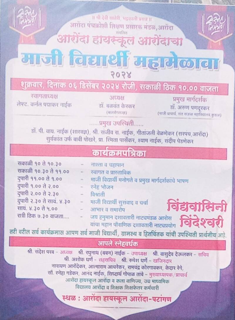 *🎴आरोंदा, दि-०३ :-* आरोंदा पंचक्रोशी शिक्षण प्रसारक मंडळ आरोंदा , आरोंदा हायस्कूल चा माजी विद्यार्थी महामेळावा शुक्रवार दिनांक ६ डिसेंबर २०२४ रोजी आरोंदा हायस्कूल च्या पटांगणावर आयोजित केला आहे. या कार्यक्रमाचे अध्यक्ष डॉ.बळवंत केरकर (बालरोगतज्ज्ञ) स्वागताध्यक्ष लेपट.कर्नल पद्माकर नाईक,प्रमुख मार्गदर्शक डॉ.अरुण पणदूरकर( माजी प्राचार्य ,संत राऊळ महाविद्यालय कुडाळ) यांचे मार्गदर्शन लाभणार आहे. तसेच डॉक्टर पी वाय नाईक ( शारवज्ञ) श्री संजीव रा. नाईक,गीतांजली वेळणेकर ( सरपंच आरोंदा) श्री सूर्यकांत (बाबी) पोखरे, प्रा.स्मिता पार्सेकर,श्याम नाईक,संदीप पेडणेकर यांच्या प्रमुख उपस्थितीत हा कार्यक्रम संपन्न होणार आहे.या कार्यक्रमाचे स्वरूप,स.१० ते १०:३० नाश्ता चहापान, स .१०:३० ते ११:०० स्वागत व प्रास्ताविक, स.११ ते १:०० माजी विद्यार्थ्यांचे मनोगत व प्रमुख मार्गदर्शकांचे भाषण, दु. १ ते २:०० स्नेहभोजन ,दू. २ ते २:३० विश्रांती, दु. २:३० ते सायं.४:३० माजी विद्यार्थी सुसंवाद व चर्चा,सायं.४:३० ते ५:०० आभार व समारोप, तसेच रात्रौ ७:३० वाजता जय हनुमान दशावतार नाट्य मंडळ आरोस यांचा “विंद्यवासिनी विंद्येश्वरी” हा नाट्य प्रयोग होणार आहे. तरी या कार्यक्रमाला सर्व माजी विद्यार्थी,ग्रामस्थ व हितचिंतक यांनी उपस्थित राहण्याचे आवाहन शालेय समिती,आरोंदा हायस्कूल व उच्च माध्यमिक विद्यालय शिक्षक शिक्षकेत्तर कर्मचारी यांनी केले आहे.