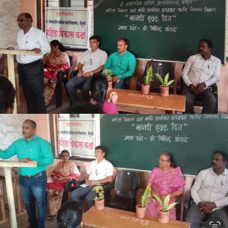 *🎴वेंगुर्ले, दि- १०:-* बाळासाहेब खर्डेकर महाविद्यालय वेंगुर्ला, महिला व बाल विकास विभाग सिंधुदुर्ग, महिला विकास कक्ष,आजीवन अध्ययन आणि विस्तार विभाग, राष्ट्रीय सेवा योजना यांच्या संयुक्त विद्यमाने मानवी अधिकार दिना निमित्य “महिला व त्यांचे मानवाधिकार ” याविषयावर चर्चा सत्र आयोजित करण्यात आले.