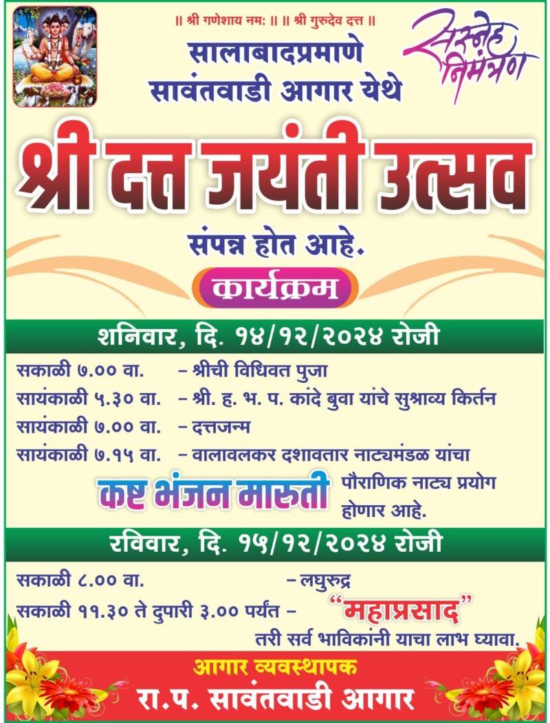 ЁЯО┤рд╕рд╛рд╡рдВрддрд╡рд╛рдбреА, рджрд┐-резрез:-┬а рд╕рд╛рд▓рд╛рдмрд╛рджрдкреНрд░рдорд╛рдгреЗ рд╕рд╛рд╡рдВрддрд╡рд╛рдбреА рдмрд╕рд╕реНрдерд╛рдирдХ рдпреЗрдереЗ рдЕрд╕рдгрд╛рд▒реНрдпрд╛ рд╢реНрд░реА рджрддреНрдд рдордВрджрд┐рд░рд╛рдд рджрддреНрдд рдЬрдпрдВрддреА рдирд┐рдорд┐рддреНрдд рджрд┐рдирд╛рдВрдХ резрек, рд╡ резрел рд░реЛрдЬреА рд╡рд┐рд╡рд┐рдз рдзрд╛рд░реНрдорд┐рдХ рдХрд╛рд░реНрдпрдХреНрд░рдорд╛рдВрдЪреЗ рдЖрдпреЛрдЬрди рдХрд░рдгреНрдпрд╛рдд рдЖрд▓реЗ рдЖрд╣реЗ. рд╢рдирд┐рд╡рд╛рд░ резрек рд░реЛрдЬреА рд╕рдХрд╛рд│реА рд╢реНрд░реА рджрддреНрдд рдордВрджрд┐рд░рд╛рдд рдореБрд░реНрддреА рдкреБрдЬрд╛ рд╣реЛрдгрд╛рд░ рддрд░ рд╕рд╛рдпрдВрдХрд╛рд│реА рд╢реНрд░реА. рд╣.рдн.рдк.рдХрд╛рдВрджреЗ рдмреБрд╡рд╛ рдпрд╛рдВрдЪреЗ рд╕реБрд╢реНрд░рд╛рд╡реНрдп рдХрд┐рд░реНрддрди рдХрд╛рд░реНрдпрдХреНрд░рдо рд╣реЛрдИрд▓. рджрддреНрдд рдЬрдиреНрдо рдЙрддреНрд╕рд╡ рд╕рд╛рдЬрд░рд╛ рдХрд░реВрди рд╕рд╛рдпрдВрдХрд╛рд│реА рд╡рд╛рд▓рд╛рд╡рд▓рдХрд░ рджрд╢рд╛рд╡рддрд╛рд░ рдирд╛рдЯреНрдп рдордВрдбрд│ рдпрд╛рдВрдЪрд╛ рдкреМрд░рд╛рдгрд┐рдХ рдирд╛рдЯреНрдп рдкреНрд░рдпреЛрдЧ рд╣реЛрдИрд▓.