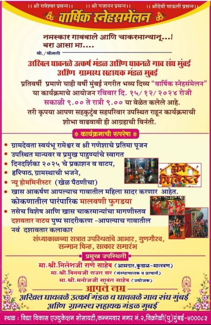*🎴मुंबई, दि- १३:-* अखिल घावनळे उत्कर्ष मंडळ अणि घावनळे गाव संघ मुंबई अणि ग्रामस्थ सहायक मंडळ मुंबई यांचे विद्या विकास एज्युकेशन सोसायटी, कन्नमवार नगर नं. २, विक्रोळी (पु) मुंबई येथे भव्य दिव्य “वार्षिक स्नेहसंमेलन” या कार्यक्रमाचे आयोजन रविवार दि. १५/१२/२०२४ रोजी सकाळी ९.०० ते रात्री ९.०० या वेळेत केलेले आहे.