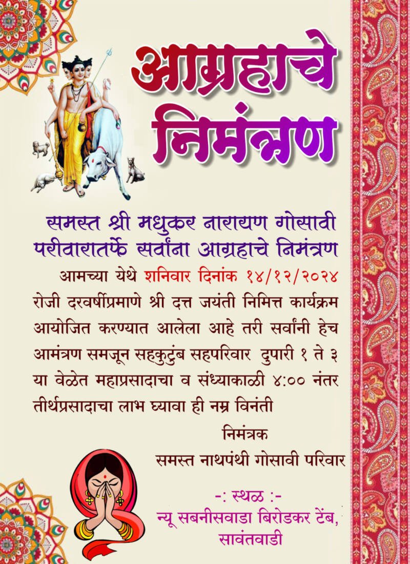 ЁЯЫС рдирд╛рдердкрдВрдереА рдЧреЛрд╕рд╛рд╡реА рдкрд░реАрд╡рд╛рд░рд╛рдХрдбреВрди рдЖрдЬ рджрддреНрдд рдЬрдпрдВрддреА рдирд┐рдорд┐рддреНрдд рдХрд╛рд░реНрдпрдХреНрд░рдорд╛рдЪреЗ рдЖрдпреЛрдЬрди..
