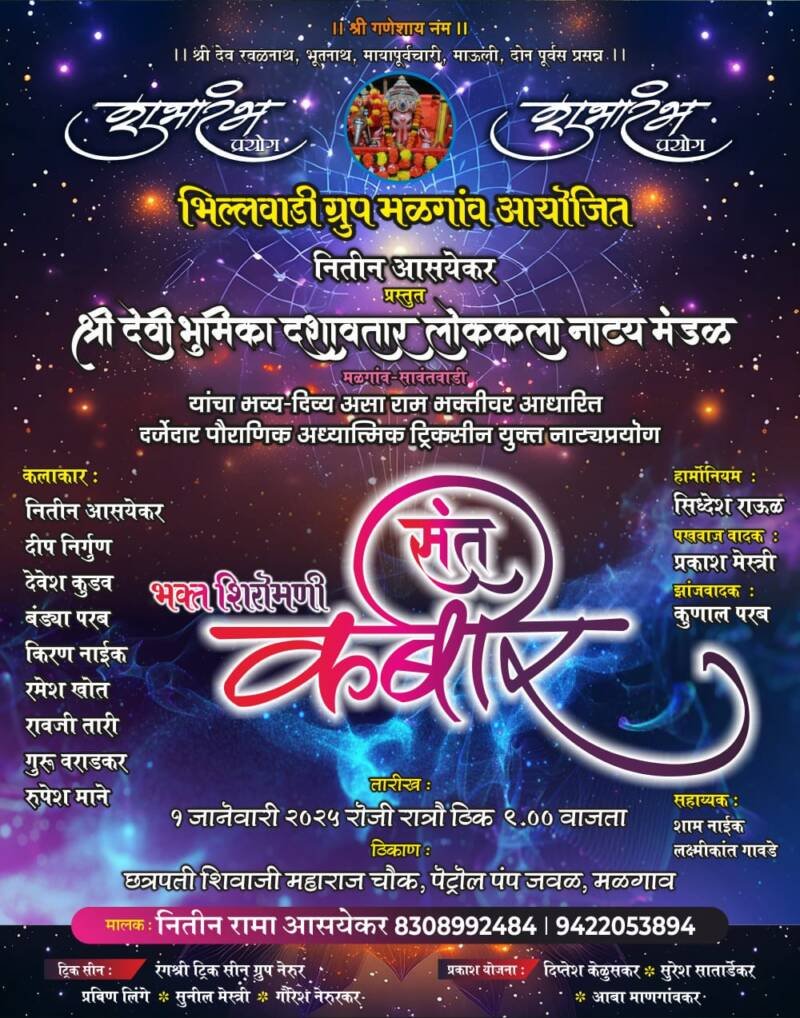 ЁЯО┤рд╕рд╛рд╡рдВрддрд╡рд╛рдбреА, рджрд┐-реиреи:- рднрд┐рд▓реНрд▓рд╡рд╛рдбреА рдЧреГрдк рдорд│рдЧрд╛рд╡ рдЖрдпреЛрдЬрд┐рдд рд╕рд┐рдВрдзреБрджреБрд░реНрдЧрд╛рддреАрд▓ рдкреНрд░рд╕рд┐рджреНрдз рджрд╢рд╛рд╡рддрд╛рд░ рдХрд▓рд╛рдХрд╛рд░ рдирд┐рддрд┐рди рдЖрд╕рдпреЗрдХрд░ рдкреНрд░рд╕реНрддреБрдд рд╢реНрд░реА рджреЗрд╡реА рднреБрдорд┐рдХрд╛ рджрд╢рд╛рд╡рддрд╛рд░ рд▓реЛрдХрдХрд▓рд╛ рдирд╛рдЯреНрдп рдордВрдбрд│ рдпрд╛рдВрдЪрд╛ рднрд╡реНрдп-рджрд┐рд╡реНрдп рдЕрд╕рд╛ рд░рд╛рдо рднрдХреНрддреАрд╡рд░ рдЖрдзрд╛рд░рд┐рдд рджрд░реНрдЬреЗрджрд╛рд░ рдкреМрд░рд╛рдгрд┐рдХ рдЕрдзреНрдпрд╛рддреНрдорд┐рдХ рдЯреНрд░рд┐рдХреНрд╕реАрди рдпреБрдХреНрдд рдирд╛рдЯреНрдпрдкреНрд░рдпреЛрдЧ *”рднрдХреНрдд рд╢рд┐рд░реЛрдордгреА рд╕рдВрдд рдХрдмреАрд░”* рдЪреЗ рдЖрдпреЛрдЬрди рез рдЬрд╛рдиреЗрд╡рд╛рд░реА реирежреирел рд░реЛрдЬреА рд░рд╛рдЮреМ рдард┐рдХ реп рд╡рд╛рдЬрддрд╛ рдорд│рдЧрд╛рд╡ рдпреЗрдереАрд▓ рдЫрдЮрдкрддреА рд╢рд┐рд╡рд╛рдЬреА рдорд╣рд╛рд░рд╛рдЬ рдЪреМрдХ рдпреЗрдереЗ рдХрд░рдгреНрдпрд╛рдд рдЖрд▓реЗ рдЖрд╣реЗ.