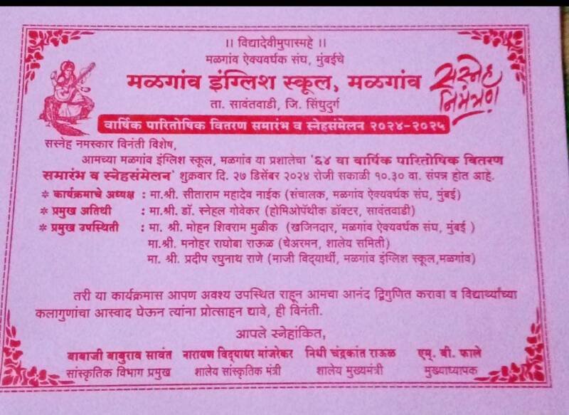 рдХрд╛рд░реНрдпрдХреНрд░рдорд╛рдЪреЗ рдЕрдзреНрдпрдХреНрд╖ рдорд│рдЧрд╛рд╡ рдРрдХреНрдпрд╡рд░реНрдзрдХ рд╕рдВрдШ рдореБрдВрдмрдИрдЪреЗ рд╕рдВрдЪрд╛рд▓рдХ рд╕реАрддрд╛рд░рд╛рдо рдирд╛рдИрдХ, рддрд░ рдкреНрд░рдореБрдЦ рдЕрддрд┐рдереА рдбреЙ. рд╕реНрдиреЗрд╣рд▓ рдЧреЛрд╡реЗрдХрд░ (рд╣реЛрдорд┐рдУрдкреЕрдереАрдХ рдбреЙрдХреНрдЯрд░, рд╕рд╛рд╡рдВрддрд╡рд╛рдбреА) рдЕрд╕реВрди рдорд│рдЧрд╛рд╡ рдРрдХреНрдпрд╡рд░реНрдзрдХ рд╕рдВрдШ рдореБрдВрдмрдИрдЪреЗ рдЦрдЬрд┐рдирджрд╛рд░ рдореЛрд╣рди рдореБрд│реАрдХ, рд╢рд╛рд│рд╛ рд╡реНрдпрд╡рд╕реНрдерд╛рдкрди рд╕рдорд┐рддреА рдЕрдзреНрдпрдХреНрд╖ рдордиреЛрд╣рд░ рд░рд╛рдКрд│, рд╢рд╛рд│реЗрдЪреЗ рдорд╛рдЬреА рд╡рд┐рджреНрдпрд╛рд░реНрдереА рдкреНрд░рджреАрдк рд░рд╛рдгреЗ рдЖрджреА рдорд╛рдиреНрдпрд╡рд░ рдЙрдкрд╕реНрдерд┐рдд рд░рд╛рд╣рдгрд╛рд░ рдЖрд╣реЗрдд. рд╕рдХрд╛рд│рдЪреНрдпрд╛ рд╕рддреНрд░рд╛рдд рдорд╛рдиреНрдпрд╡рд░рд╛рдВрдЪреНрдпрд╛ рд╣рд╕реНрддреЗ рдкрд╛рд░рд┐рддреЛрд╖рд┐рдХ рд╡рд┐рддрд░рдг рддрд░ рд╕рд╛рдпрдВрдХрд╛рд│рдЪреНрдпрд╛ рд╕рддреНрд░рд╛рдд рд╡рд┐рджреНрдпрд╛рд░реНрдереНрдпрд╛рдВрдЪреЗ рд╡рд┐рд╡рд┐рдз рдЧреБрдгрджрд░реНрд╢рдХ рдХрд╛рд░реНрдпрдХреНрд░рдо рд╣реЛрдгрд╛рд░ рдЖрд╣реЗрдд, рдпрд╛ рд╕рд░реНрд╡ рдХрд╛рд░реНрдпрдХреНрд░рдорд╛рд╕ рдкрд╛рд▓рдХ, рдорд╛рдЬреА рд╡рд┐рджреНрдпрд╛рд░реНрдереА, рдЧреНрд░рд╛рдорд╕реНрдерд╛рдВрдиреА рдЙрдкрд╕реНрдерд┐рдд рд░рд╛рд╣реВрди рд╡рд┐рджреНрдпрд╛рд░реНрдереНрдпрд╛рдВрдЪрд╛ рдЖрдирдВрдж рджреНрд╡рд┐рдЧреБрдгрд┐рдд рдХрд░рд╛рд╡рд╛ рд╡ рд╡рд┐рджреНрдпрд╛рд░реНрдереНрдпрд╛рдВрдЪреНрдпрд╛ рдХрд▓рд╛рдЧреБрдгрд╛рдВрдЪрд╛ рдЖрд╕реНрд╡рд╛рдж рдШреЗрдКрди рддреНрдпрд╛рдВрдирд╛ рдкреНрд░реЛрддреНрд╕рд╛рд╣рди рджреНрдпрд╛рд╡реЗ, рдЕрд╕реЗ рдЖрд╡рд╛рд╣рди рдореБрдЦреНрдпрд╛рдзреНрдпрд╛рдкрдХ рдПрдо. рдмреА. рдлрд╛рд▓реЗ, рд╕рд╛рдВрд╕реНрдХреГрддрд┐рдХ рд╡рд┐рднрд╛рдЧ рдкреНрд░рдореБрдЦ рдмрд╛рдмрд╛рдЬреА рд╕рд╛рд╡рдВрдд, рд╢рд╛рд▓реЗрдп рд╕рд╛рдВрд╕реНрдХреГрддрд┐рдХ рдордВрддреНрд░реА рдирд╛рд░рд╛рдпрдг рдорд╛рдВрдЬрд░реЗрдХрд░, рд╢рд╛рд▓реЗрдп рдореБрдЦреНрдпрдордВрддреНрд░реА рдирд┐рдзреА рд░рд╛рдКрд│ рдпрд╛рдВрдиреА рдХреЗрд▓реЗ рдЖрд╣реЗ.